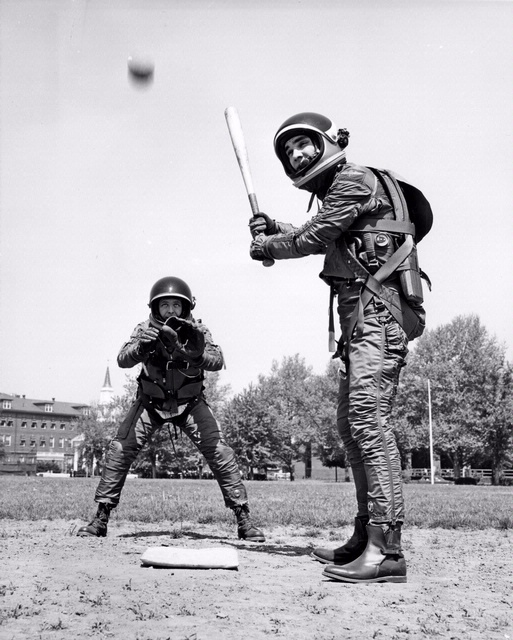 Test pilots show off the flexibility of the lightweight Mark IV suites with this 1960s baseball demonstration.