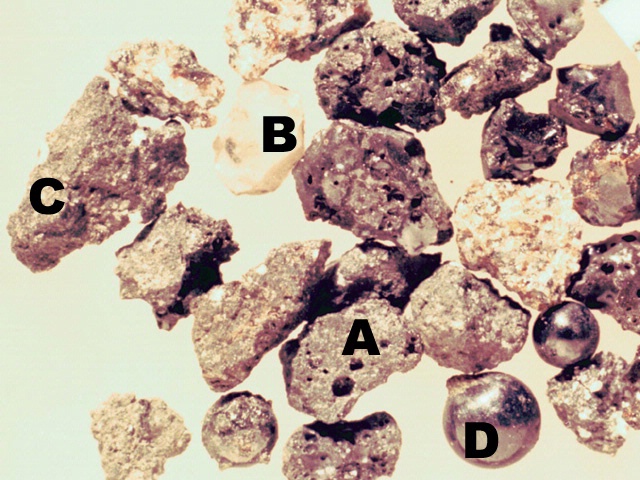 Lunar soil contains fragments of the major lunar rock types: basalt (A), anorthosite (B), and breccia (C). In addition, round glass particles (D) are common.