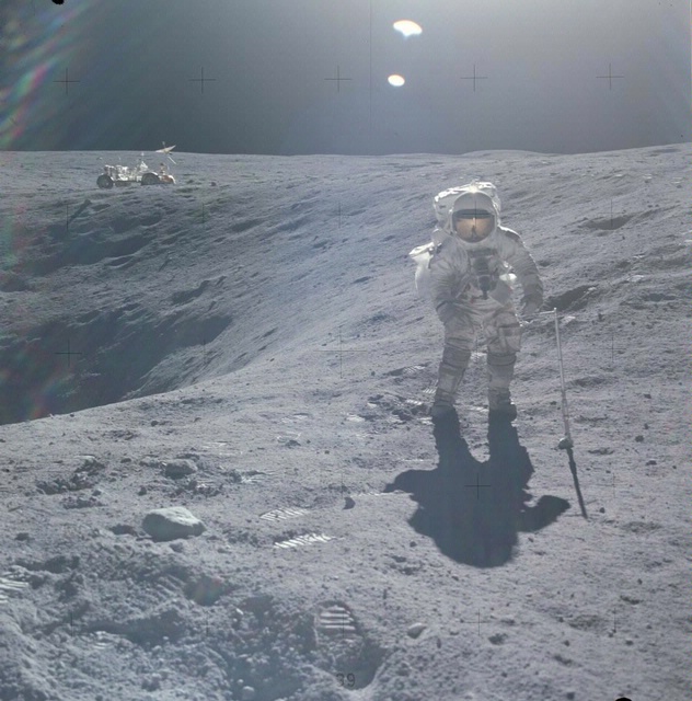 Pan frame at Apollo 16 Station 1 - Charlie Duke at edge of crater.