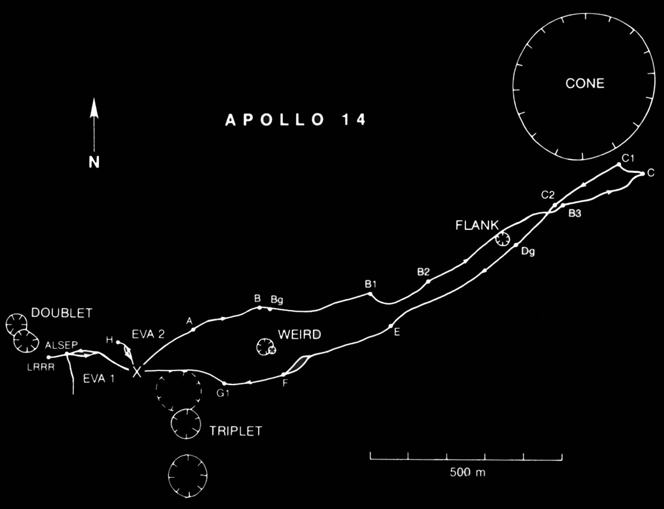Diagram based on Apollo 11, 12, and 14 traverse map prepared by the U.S. Geological Survey and published by the Defense Mapping Agency for NASA.