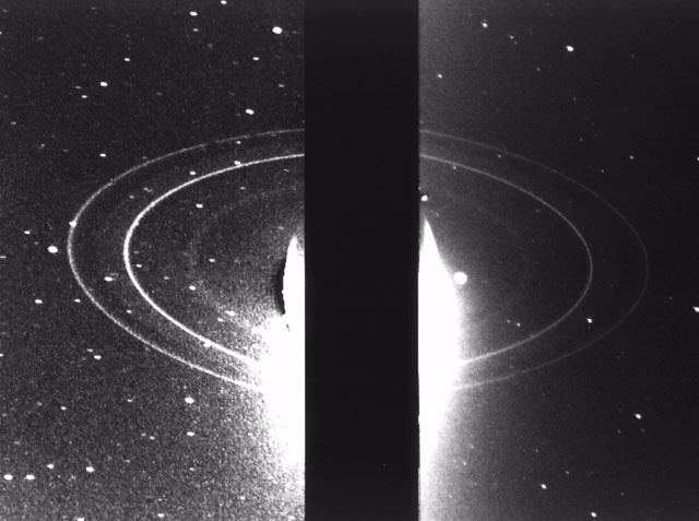 Two exposures with Neptune blacked out (center) were used to make this image of the ring system of Neptune. Neptune's rings were once thought to be incomplete arcs, but Voyager 2 discovered at least 3 new rings and imaged the complete rings. These images were made from a pair of 10-minute exposures while the Sun was behind Neptune, and faint ring particles were being lit from the back.