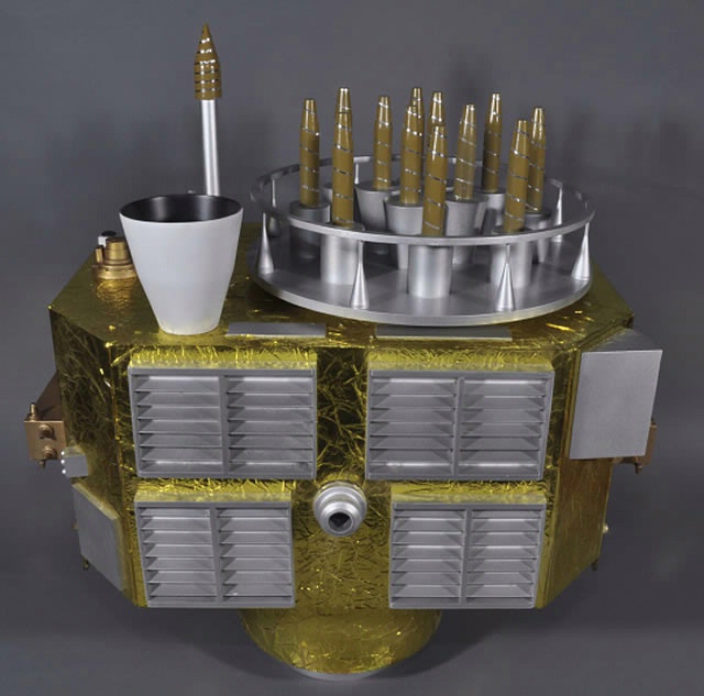 This one-quarter scale model represents the second generation, or "Block II" of satellites that make up the Navstar Global Positioning System, known as GPS.