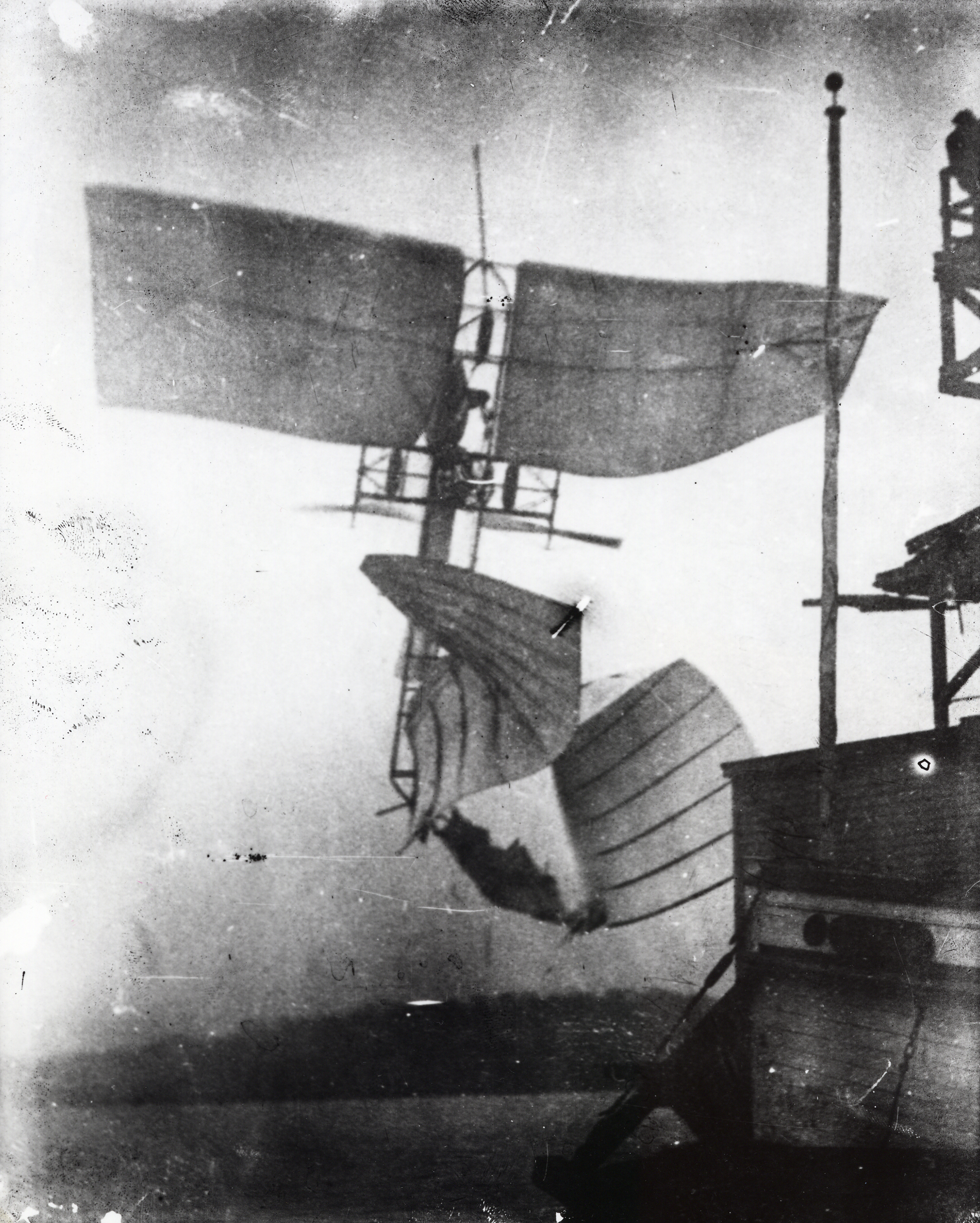Langley's Great Aerodrome collapses upon itself at takeoff on December 8, 1903.