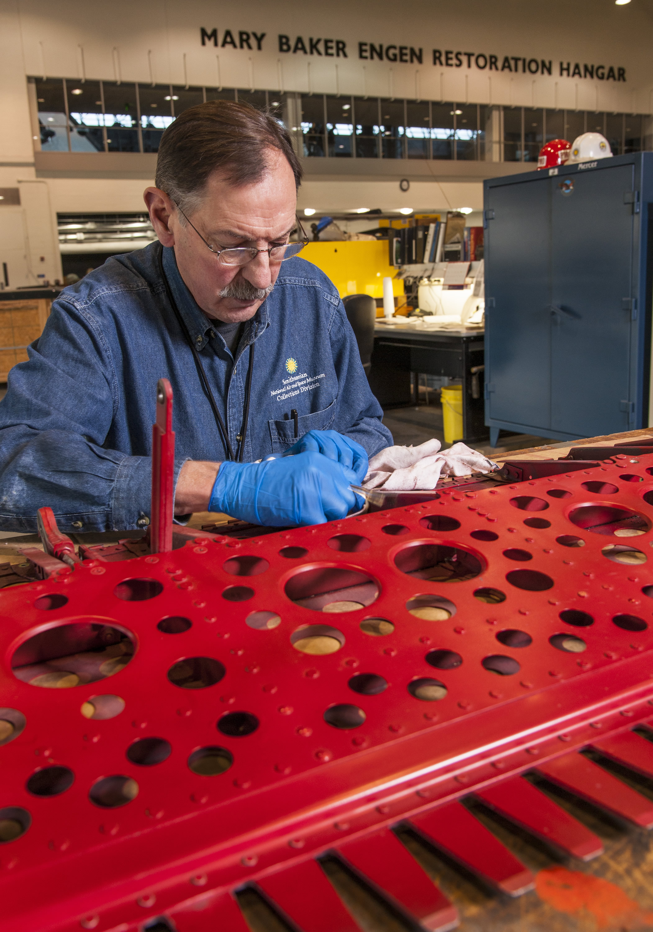 Collections staff working on the Helldiver in the Mary Baker Engen Restoration Hangar.
