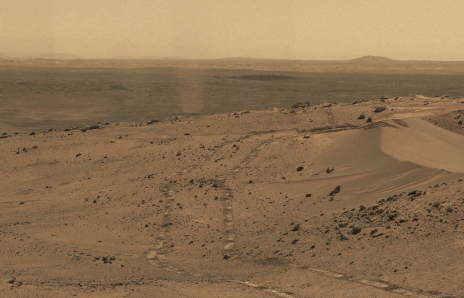 Spirit’s view from atop Husband Hill. This panoramic mosaic shows the rover’s tracks (right), other peaks of the Columbia Hills (just left of center), and the region called the Inner Basin (center), Spirit’s next destination.