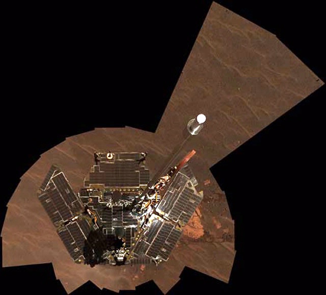 The Spirit rover took this self-portrait using its panoramic camera. The camera can look down to image the rover, but the mast on which it is mounted is not in the camera’s field of view. The rover appeared relatively free of Martian dust in December 2004 when the image was taken.