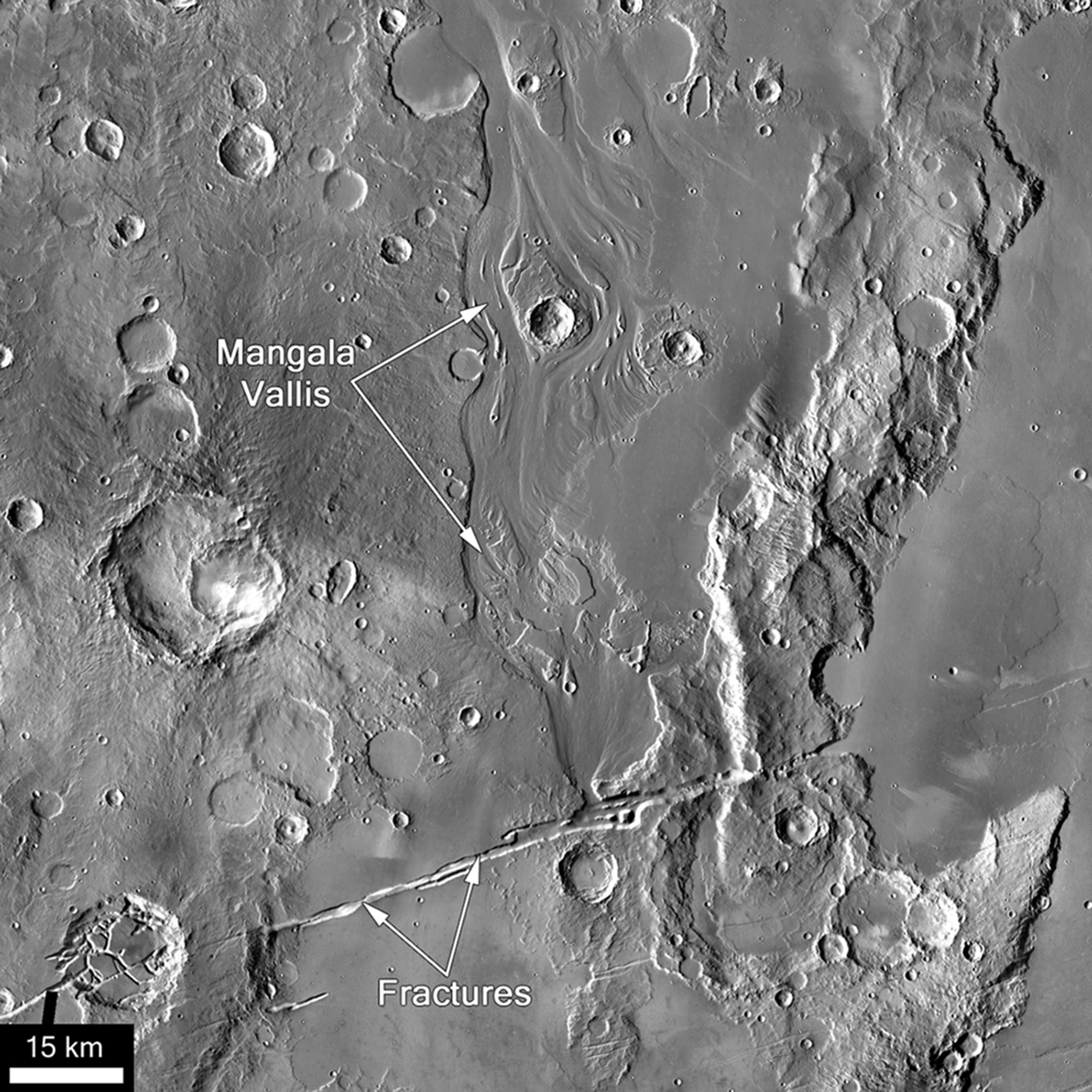 This Martian outflow channel (Mangala Vallis) emerges from fractures in the bedrock.