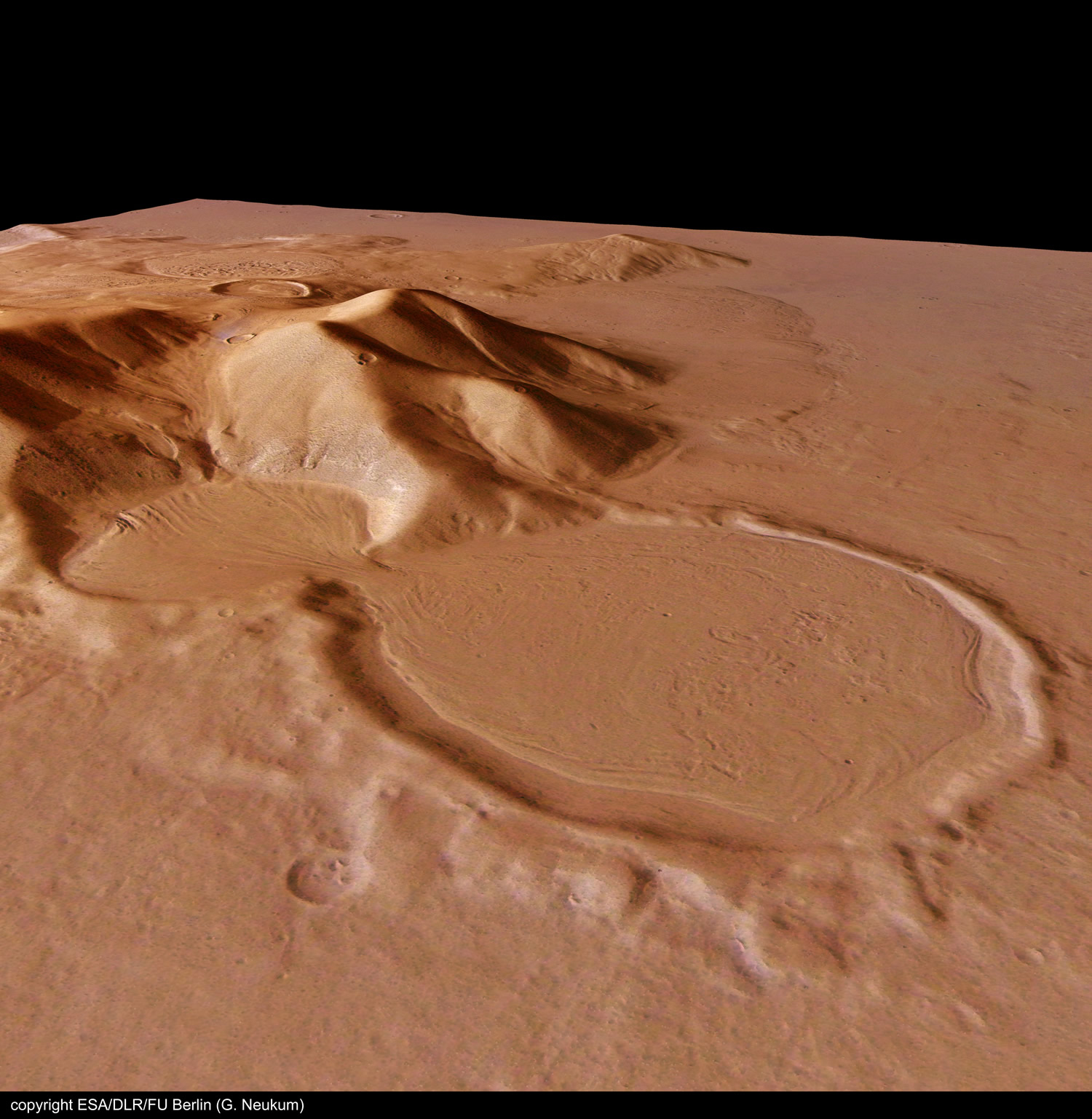 This image shows a “rock glacier” east of the giant Hellas Basin. Ice-rich material appears to have flowed from one crater (9 kilometers wide) into another. These glaciers may have formed when the planet’s spin axis was steeply tilted.
