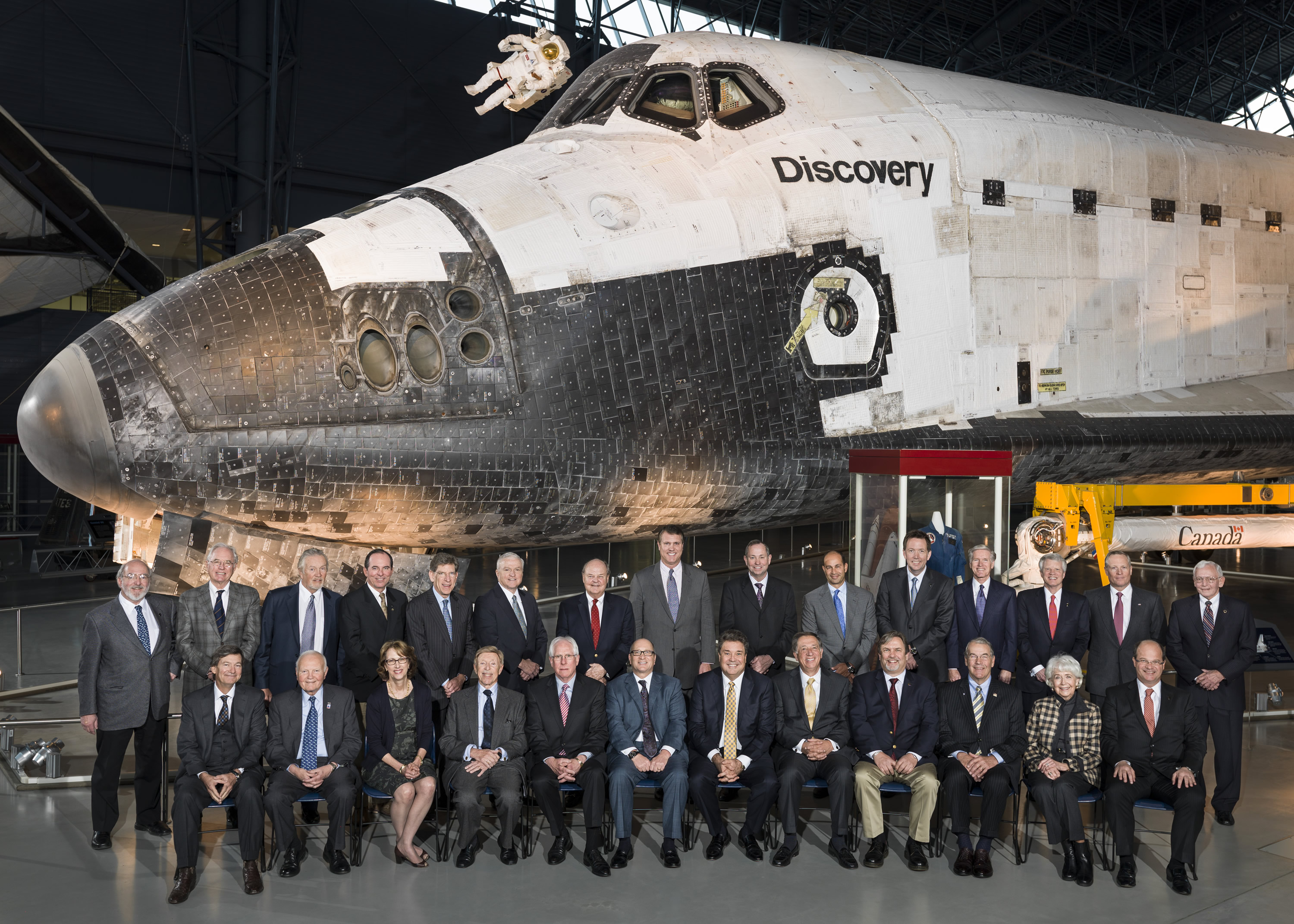 The 2014 Board of the National Air and Space Museum pose in front of Discovery.
