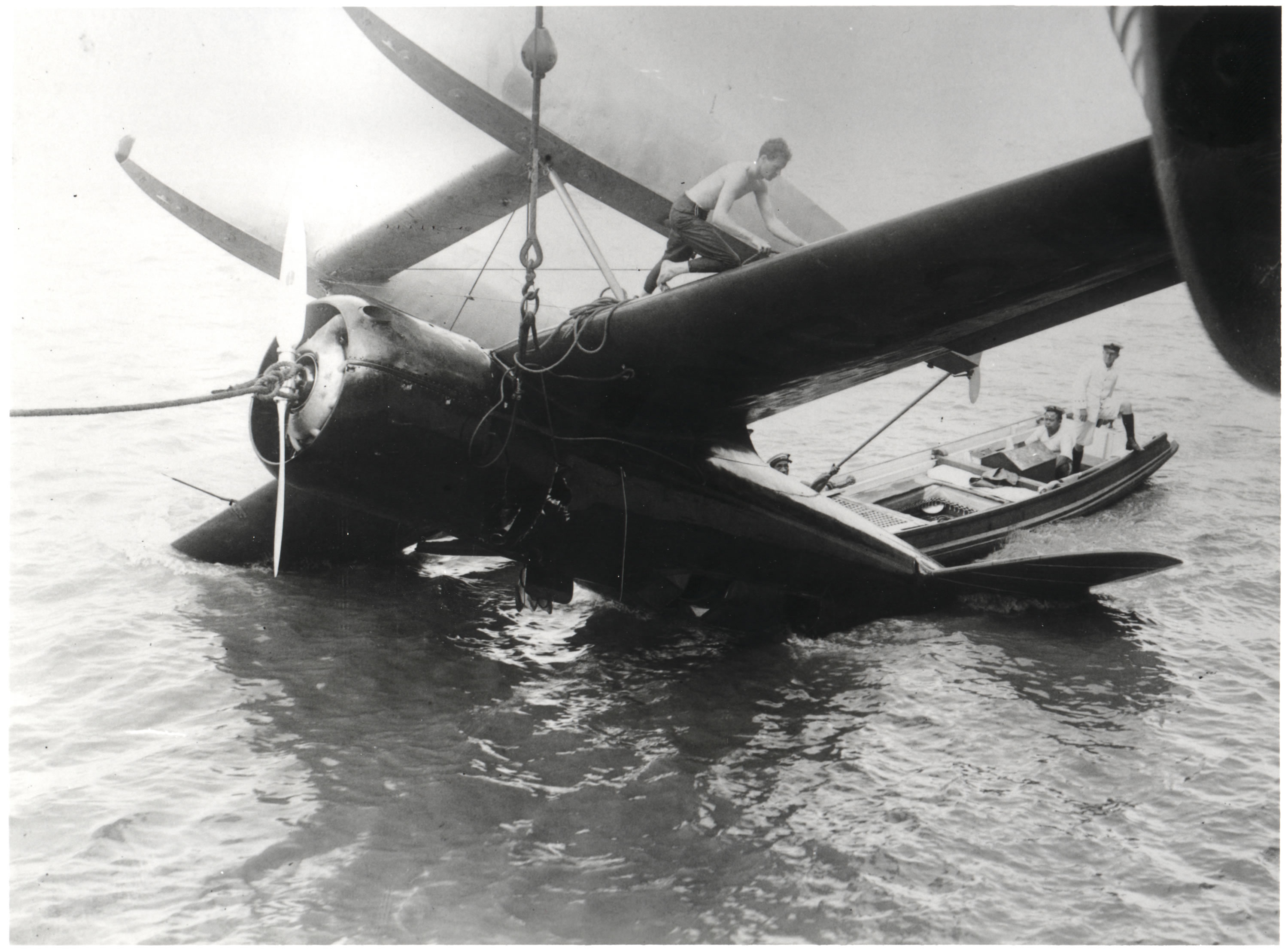 At Hankow, China, while being lowered into the Yangtze River from the British aircraft carrier Hermes, the Lindberghs' Lockheed Sirius capsized, and one of the wings hit a ship cable. The damaged airplane had to be returned to the United States for repairs, ending the Lindberghs’ 1931 survey flight.