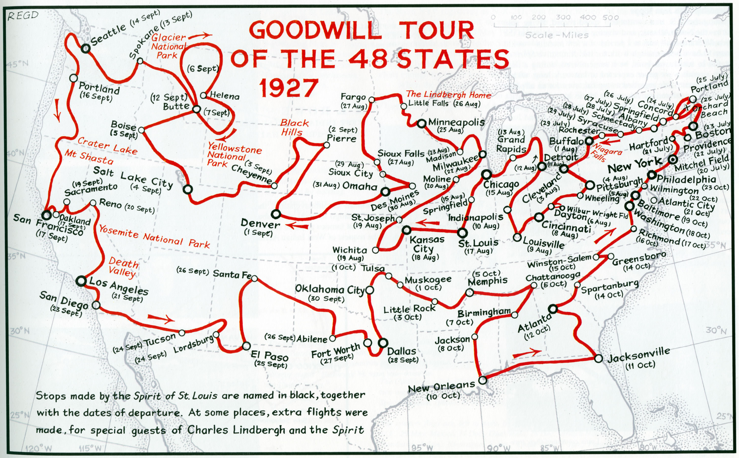 Lindbergh's Goodwill Tour began at Mitchel Field, Long Island, on July 20, 1927, and lasted 95 days. Lindbergh visited 82 cities and 23 state capitals. At each stop, he gave a short speech about aviation’s potential as a commercial enterprise.