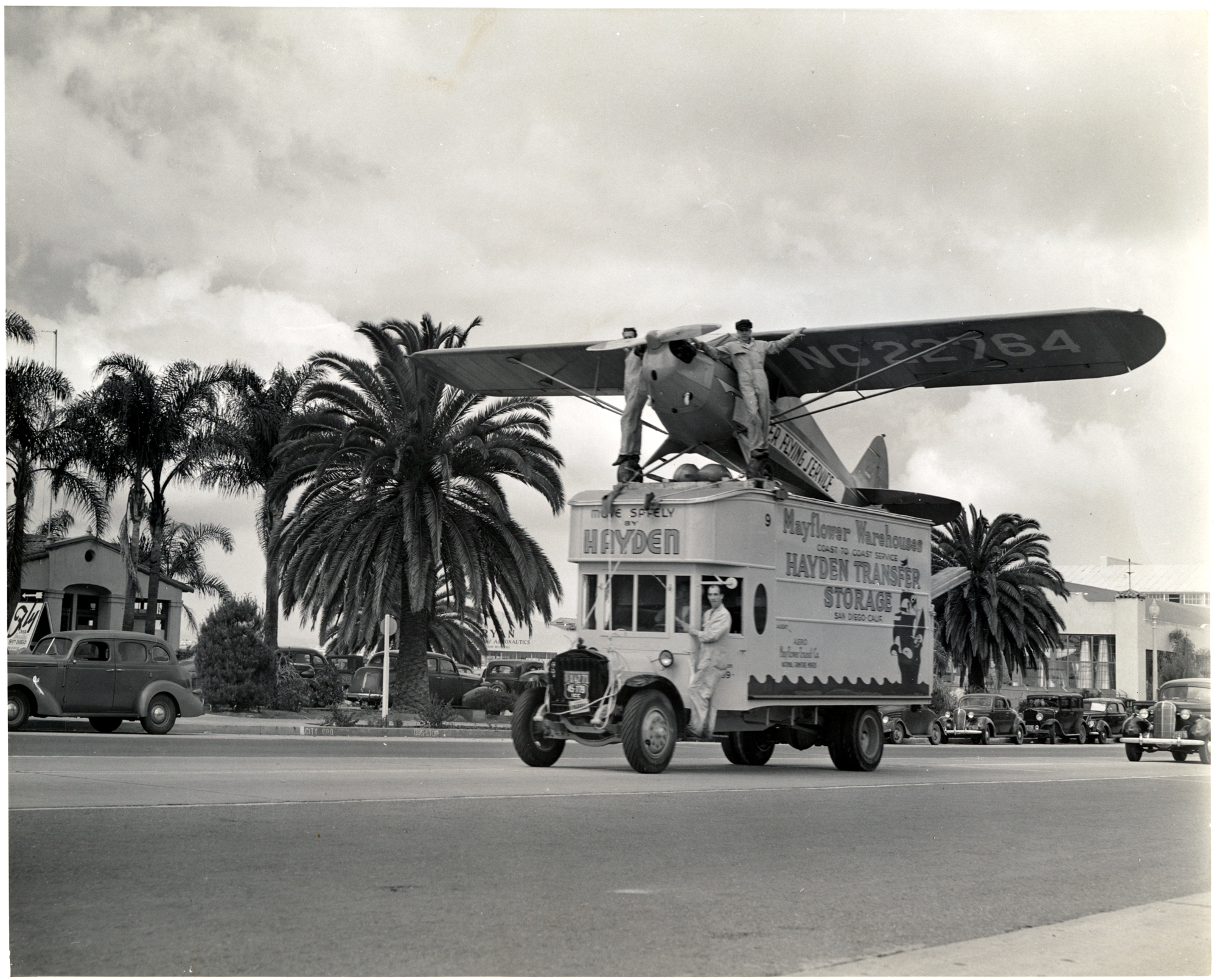 The Cub Coupe, next in the Cub series (a J-4A is shown here), featured a side-by-side cockpit for private ownership appeal. But it was still small enough to advertise on the streets of San Diego, California, circa 1940.
