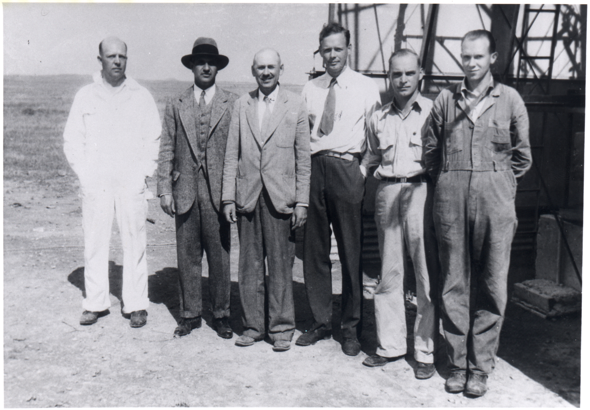 Harry Guggenheim, Robert Goddard, and Charles Lindbergh (second, third, and fourth from left) at Goddard’s rocket launch tower in Roswell, New Mexico, September 23, 1935. With them are three members of Goddard’s crew: Albert W. Kisk (far left), Nils Thure Ljungquist (second from right), and Charles W. Mansur (far right).