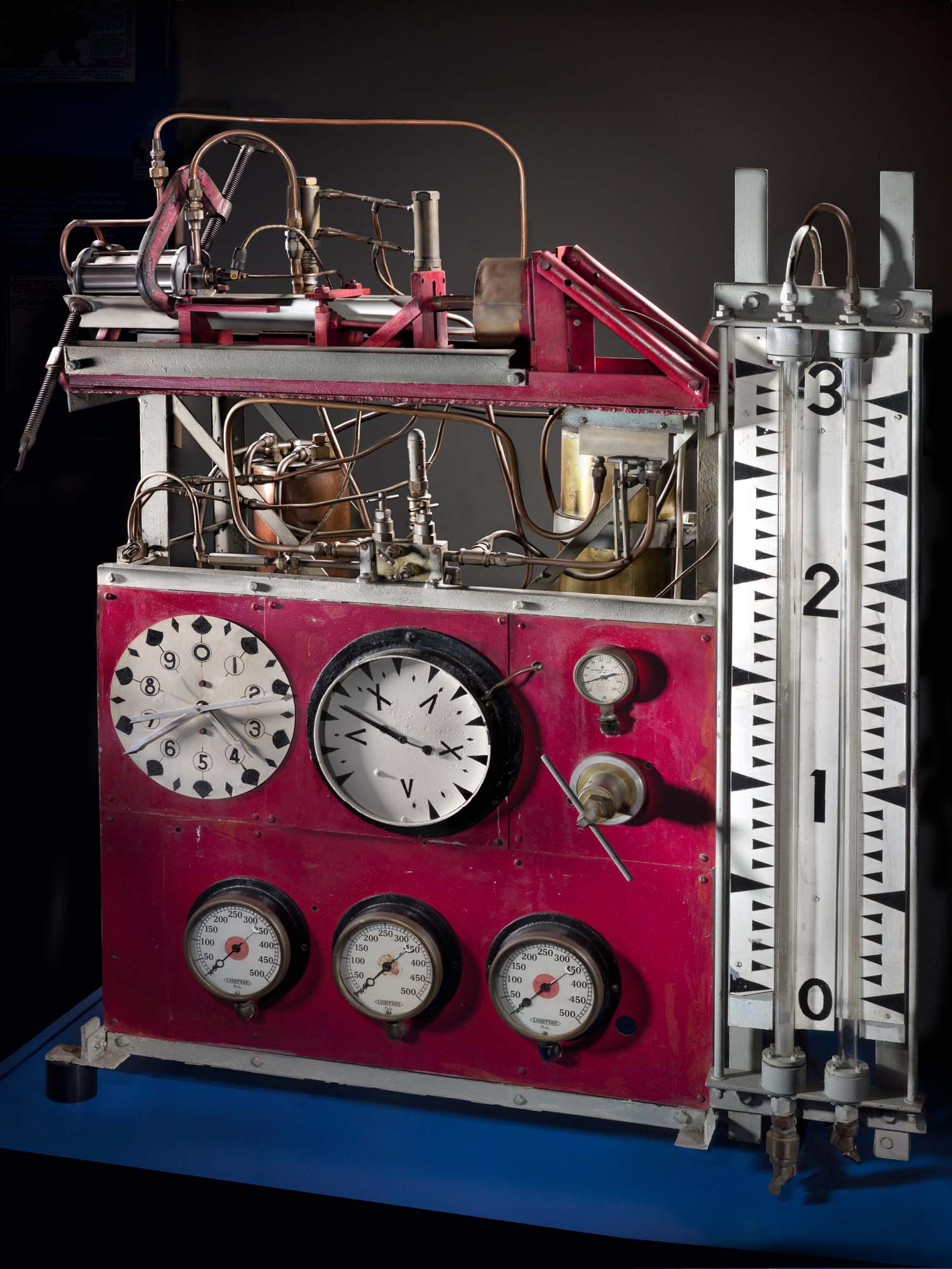 Members of the American Rocket Society built this second and more elaborate test stand in 1938 to test their liquid-fuel rocket engines. The gauges measure engine thrust, propellant feed pressures, time duration of the test, and other data. James Wyld, a young engineer in the society, tested his innovative motors on it from 1938 to 1941. The stand, which could take engines of up to 890 N (200 lb.) thrust, was rebuilt more than once and was later used by Reaction Motors, Inc., the first liquid-fuel rocket engine company in the United States. Four ARS members founded the company in 1941. A replica Wyld engine, with associated tubing and clamps, is mounted on top of the stand.