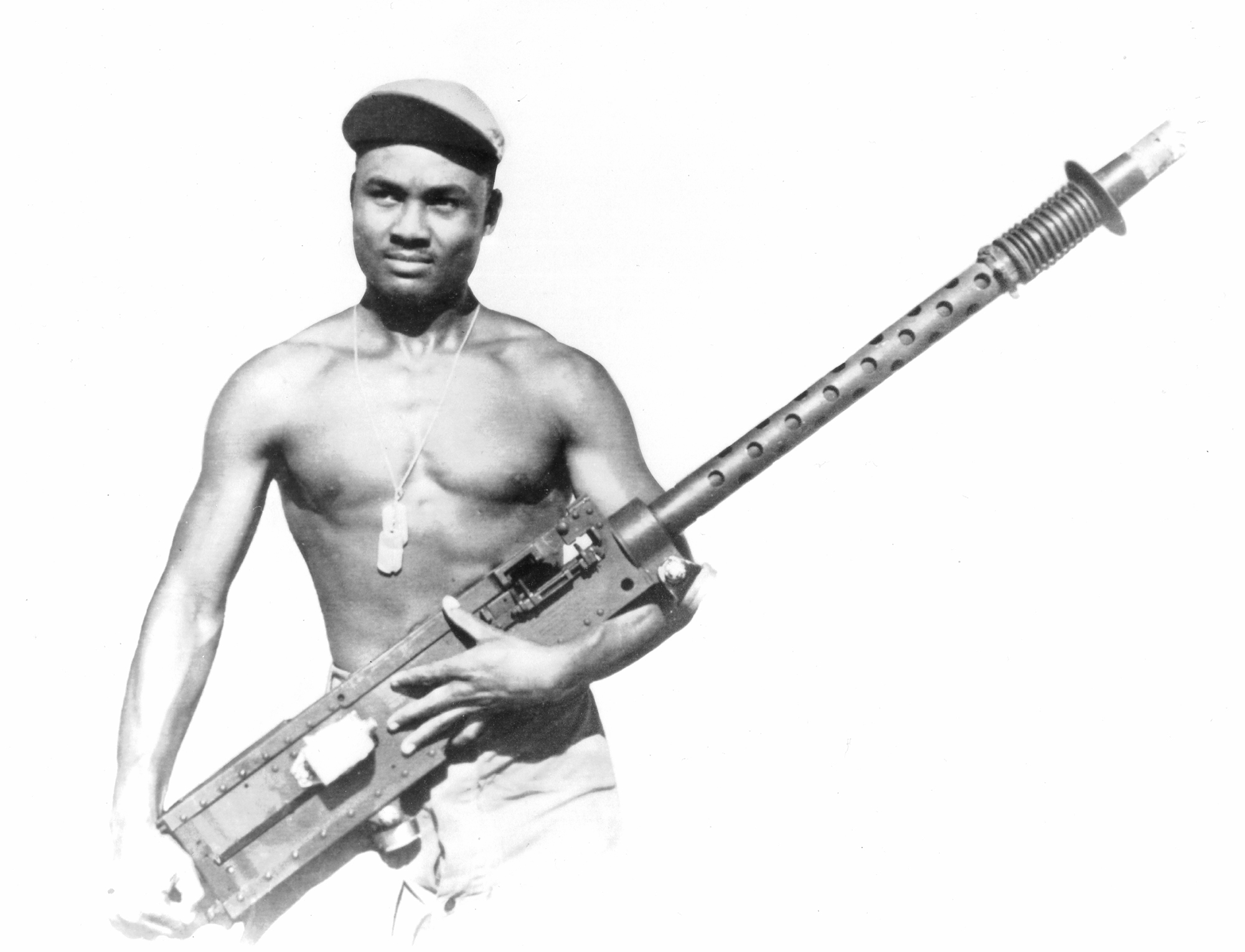 An armorer carries a .50 caliber machine gun to a work station for routine maintenance.