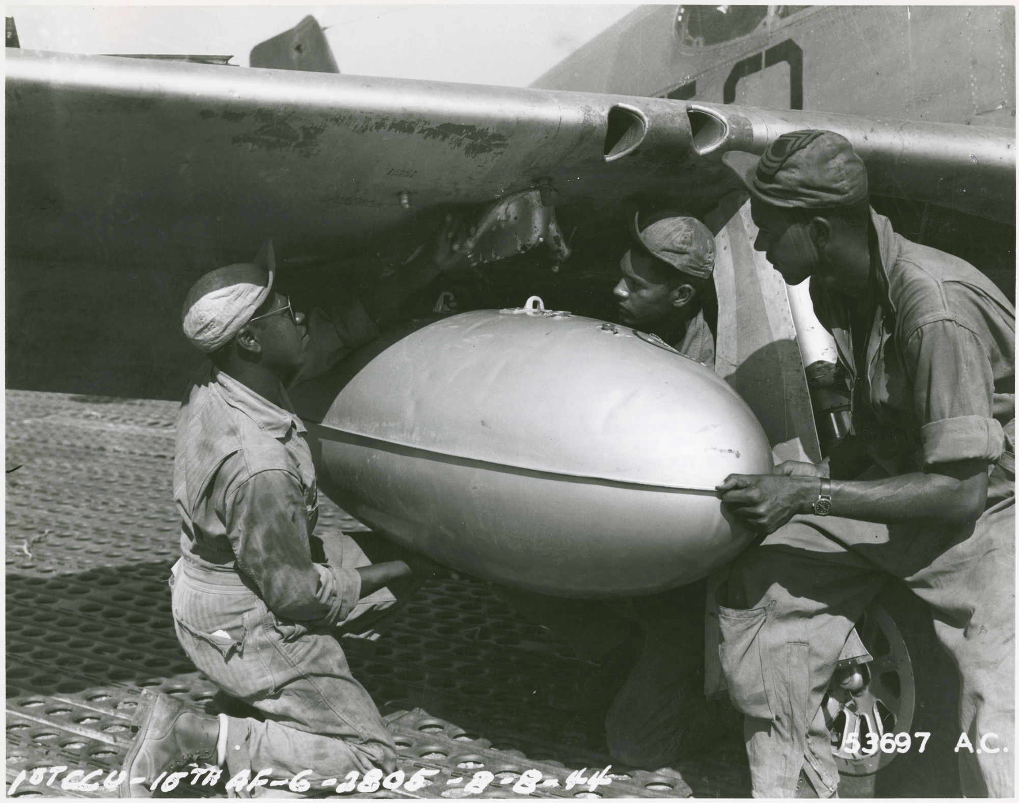 Ground crews of the 332nd Fighter Group mount a drop tank on a P-51. These fuel tanks allowed the escort fighters to extend their range deep into enemy territory.
