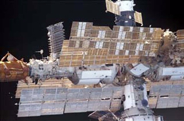 This is a view of Mir Space Station taken during rendezvous and approach operations.
