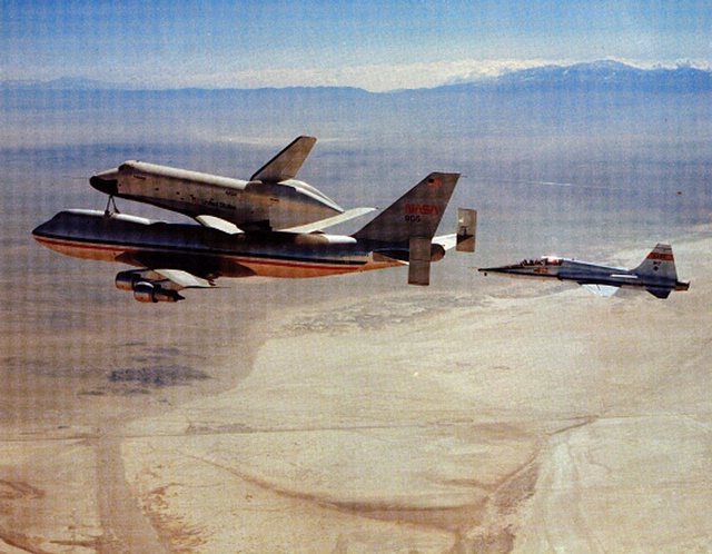 One-quarter left rear view of NASA Boeing 747-123 Shuttle Carrier Aircraft (SCA) (r/n N905NA) with the Space Shuttle Orbiter "Enterprise" (OV-101) mated to the 747 SCA. NASA Northrop T-38 r/n N913NA) chase plane in the air at right foreground.