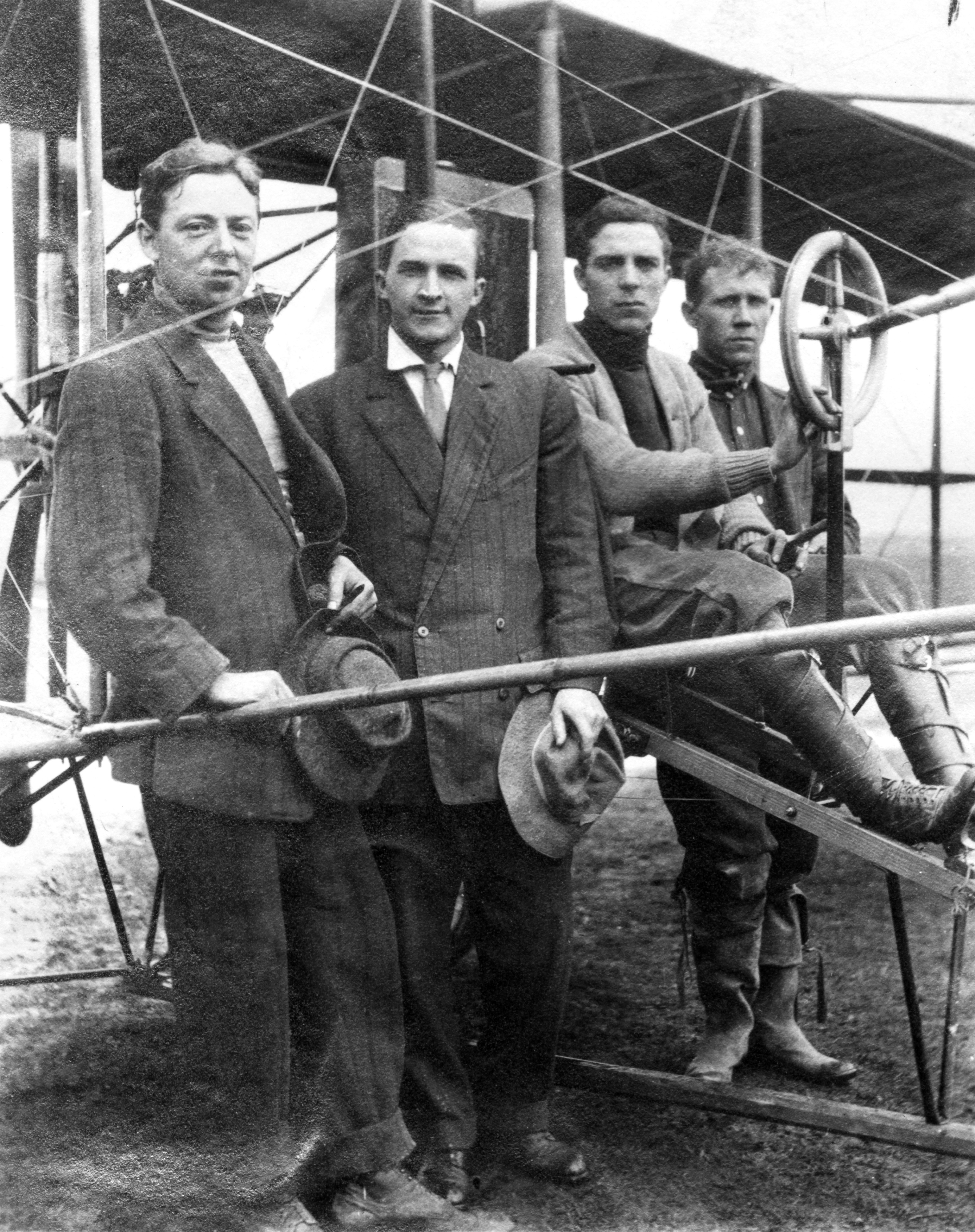 Clarence Walker (third from left) at the controls of his Curtiss Model D. In 1911 Walker make the first flight on the Big Island of Hawaii.