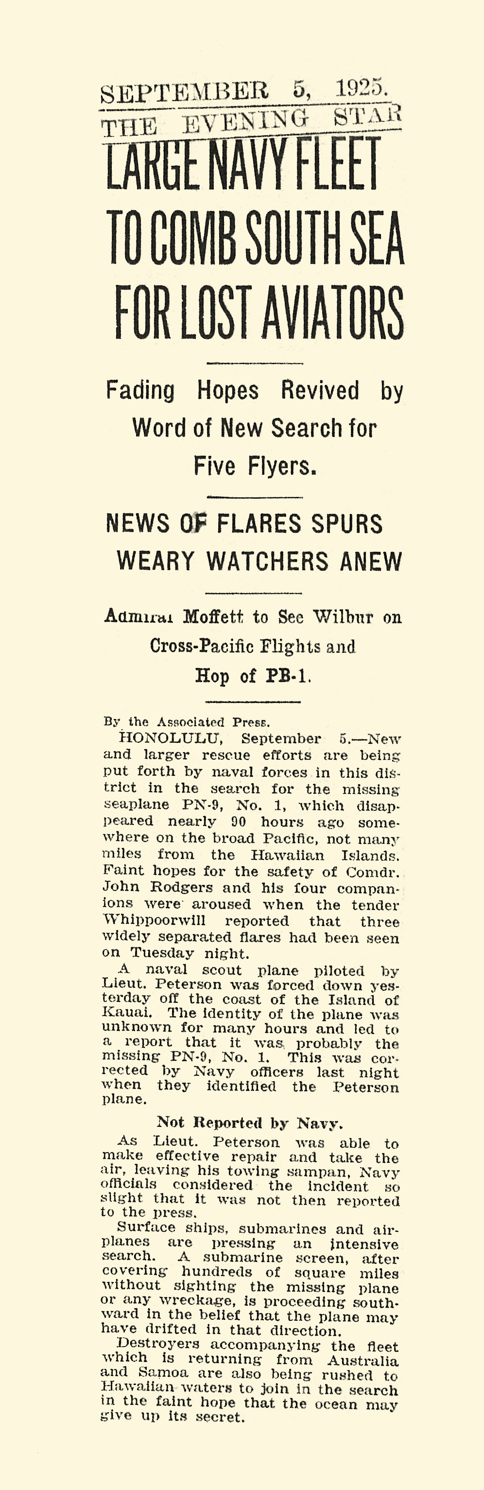The Navy launched a massive search for Cmdr. John Rodgers and his crew after their PN-9 went down on the way to Hawaii in 1925.
