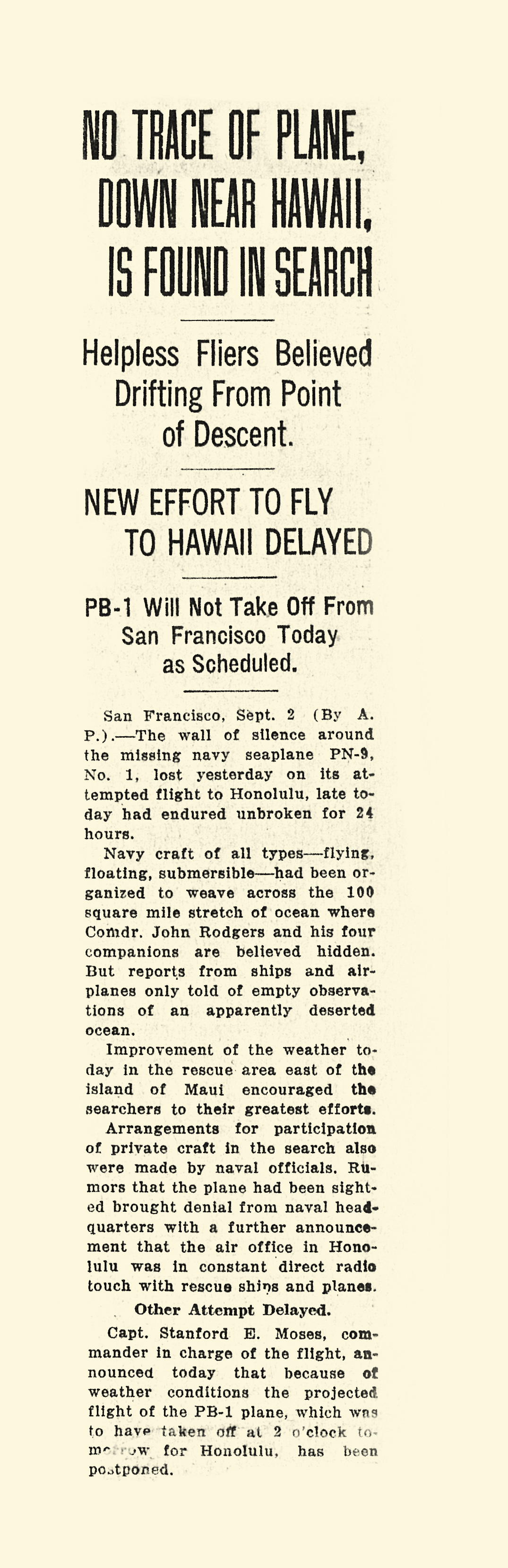The Navy launched a massive search for Cmdr. John Rodgers and his crew after their PN-9 went down on the way to Hawaii in 1925.