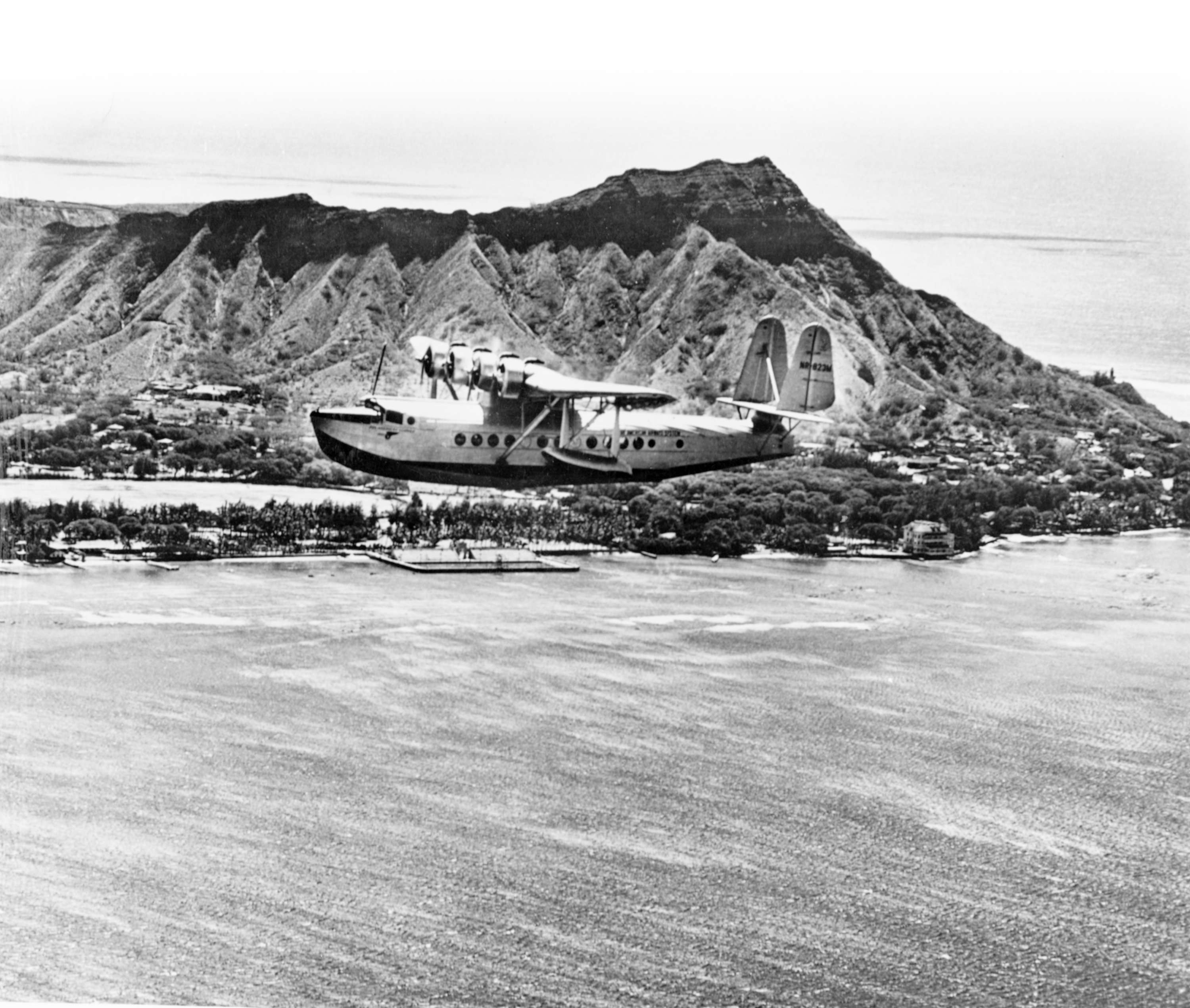 The Pan American Clipper passes Diamond Head as it arrives in Hawaii in 1935.