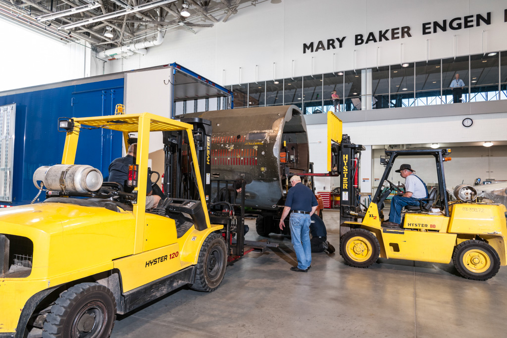 Museum specialists remove the Martin B-26B Marauder Flak-Bait's forward fuselage section from the transport trailer.