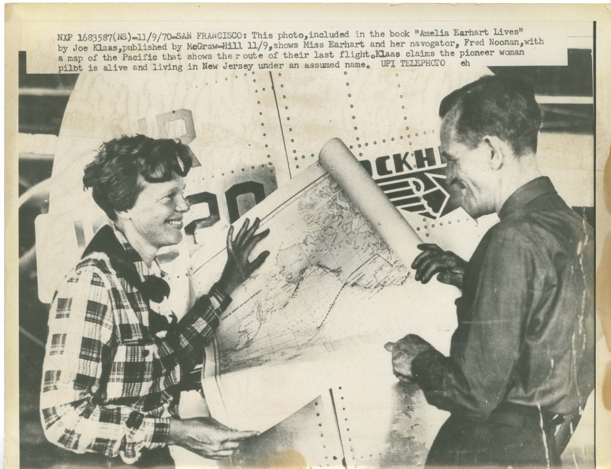 Earhart and Fred Noonan, a former Pan American Airways navigator, look over their proposed Pacific Ocean route. The caption suggests an alternative ending for Earhart.