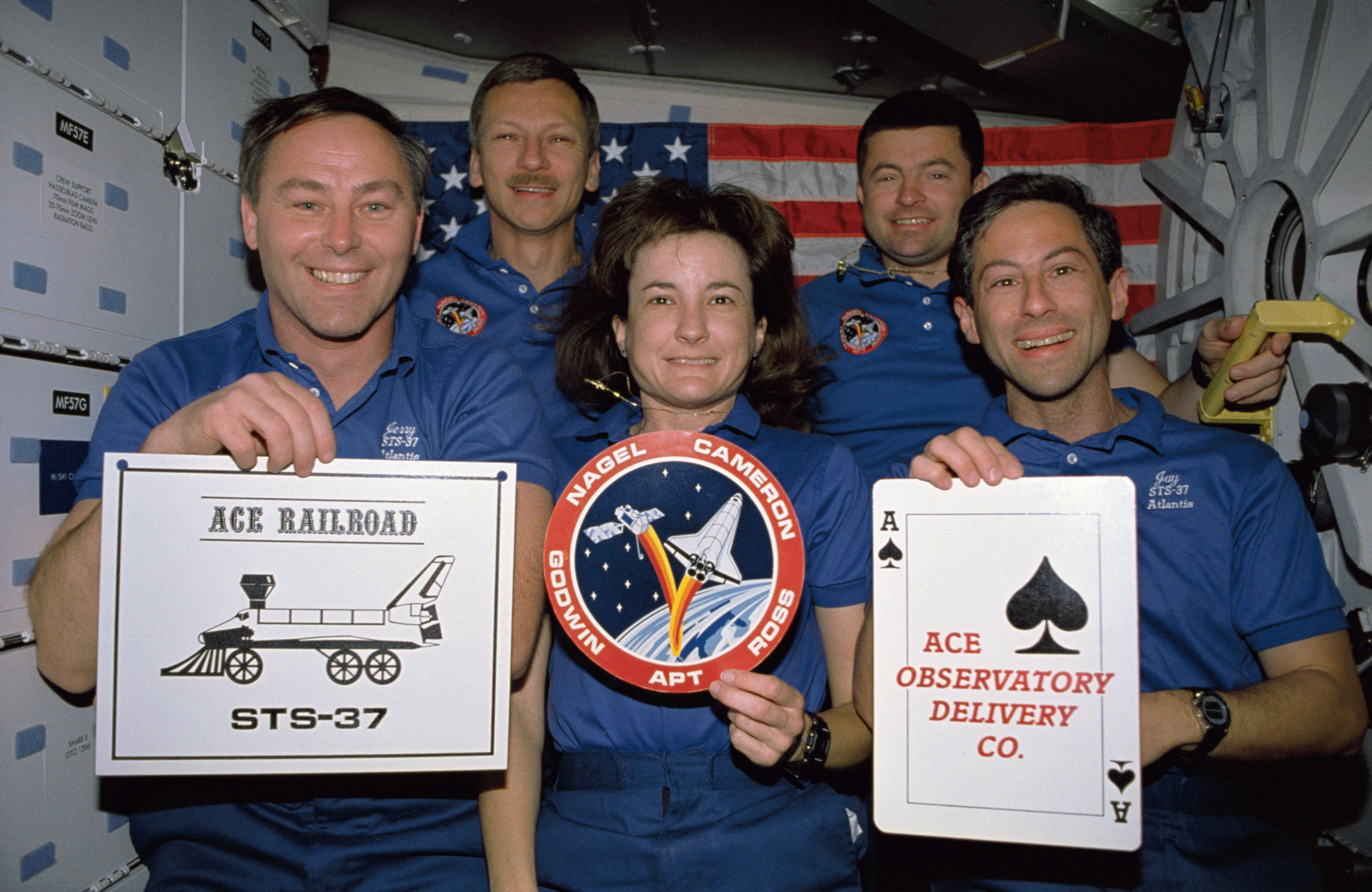 The STS-37 crew posed in flight on Atlantis after deploying the Gamma Ray Observatory. The railroad sign refers to a small equipment cart on rails tested by Jay Apt and Jerry Ross during an EVA in the payload bay.