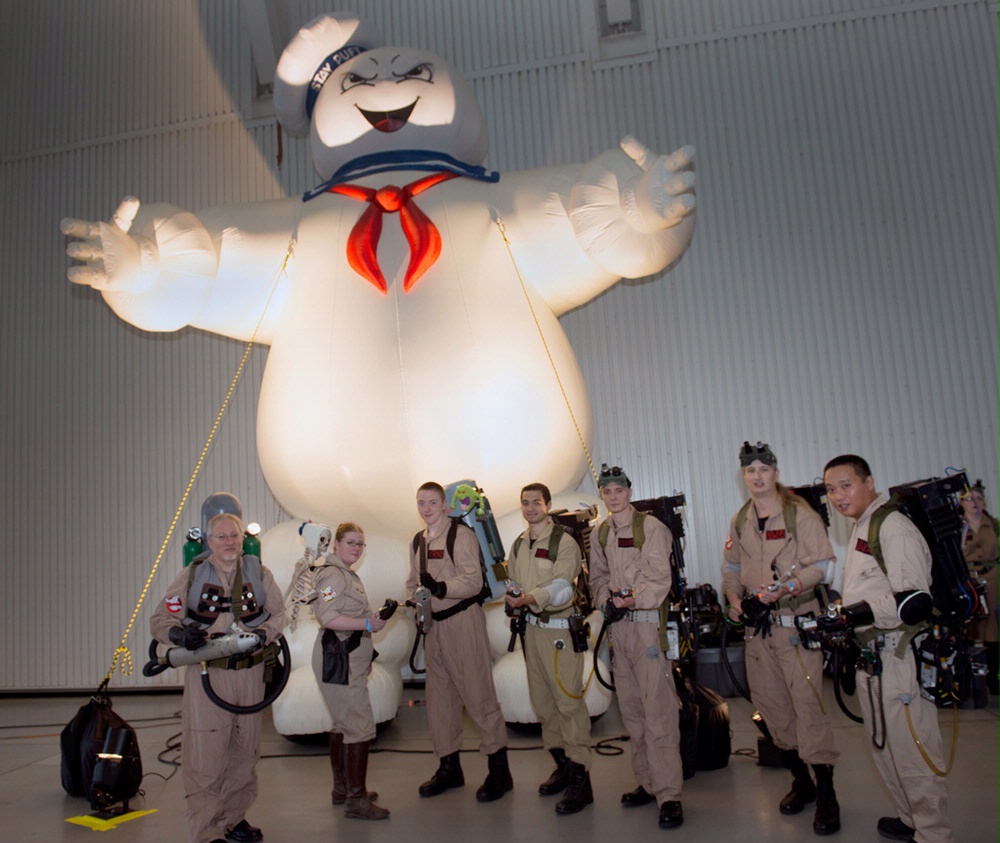Characters from the Ghostbusters movies pose with the Stay Puft Marshmallow Man at Air & Scare.