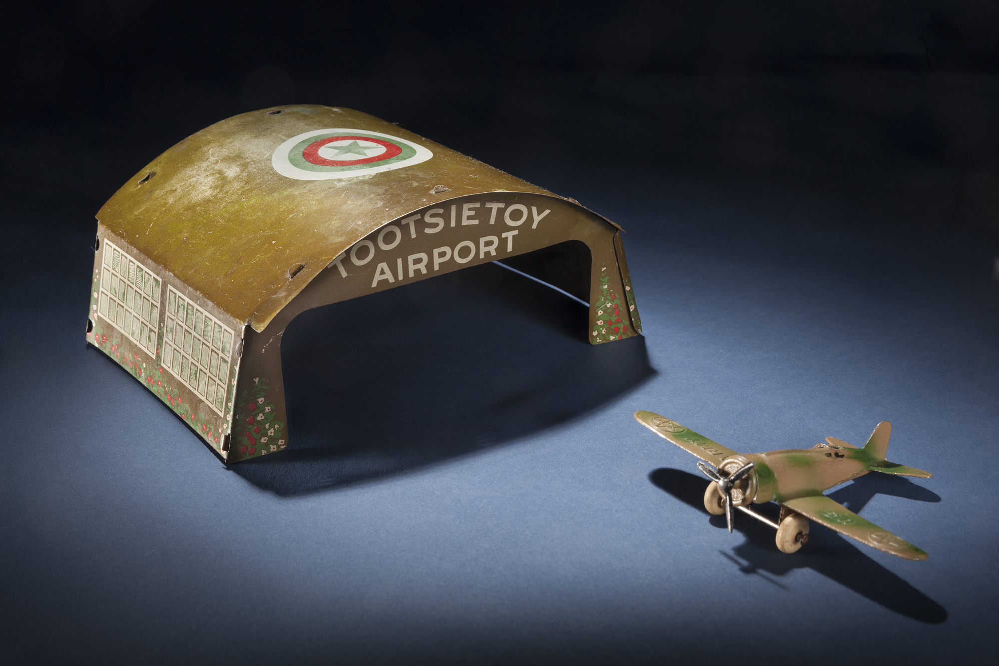 Tootsietoy's tin hangar could house both civilian and military toy aircraft.