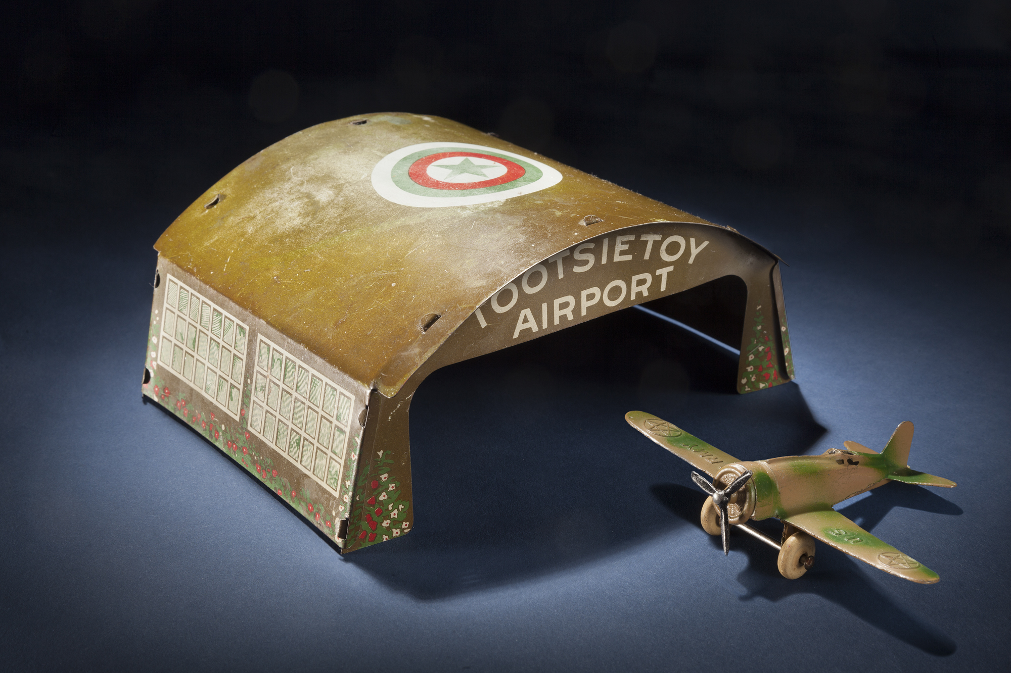 Tootsietoy's tin hangar could house both civilian and military toy aircraft.