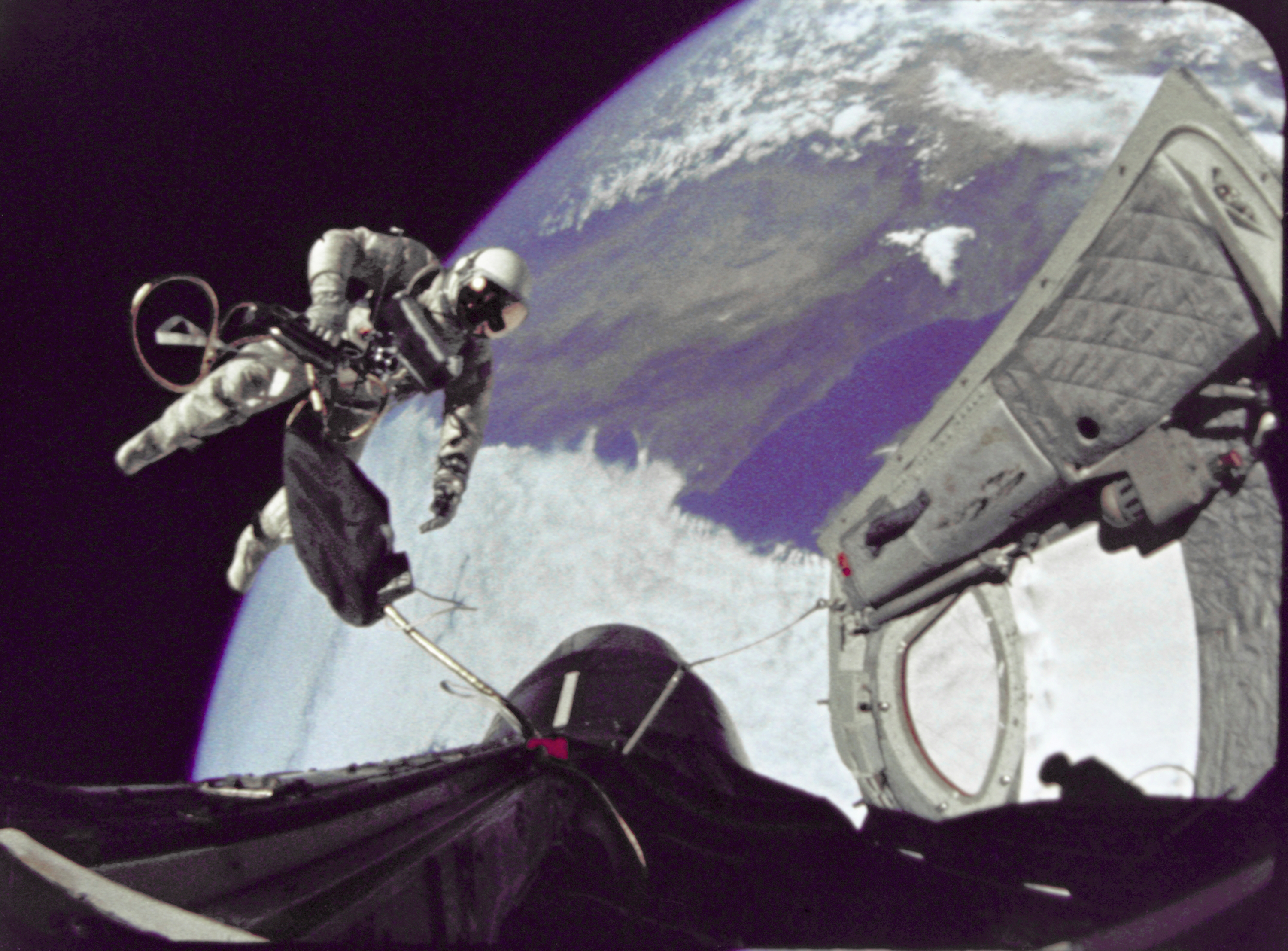 Astronaut Edward H. White II, pilot for the Gemini-Titan 4 space flight, floats in zero gravity of space. The extravehicular activity was performed during the third revolution of the Gemini 4 spacecraft. White is attached to the spacecraft by a 25-ft. umbilical line and a 23-ft. tether line, both wrapped in gold tape to form one cord. In his right hand White carries a Hand-Held Self-Maneuvering Unit (HHSMU). The visor of his helmet is gold plated to protect him from the unfiltered rays of the sun.