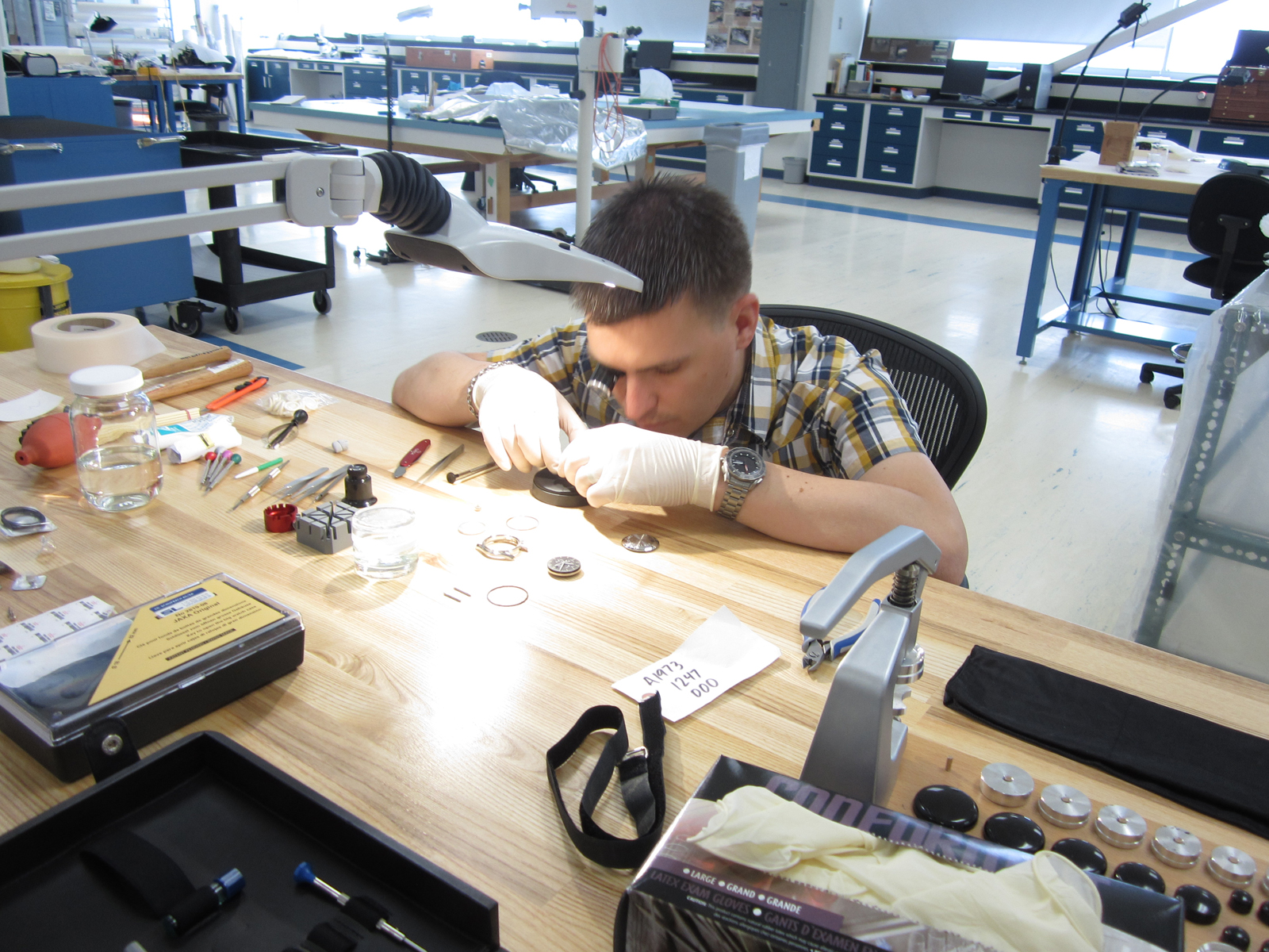 Omega watchmaker, David Julmy, inspects Neil Armstrong's Apollo 11 chronograph.