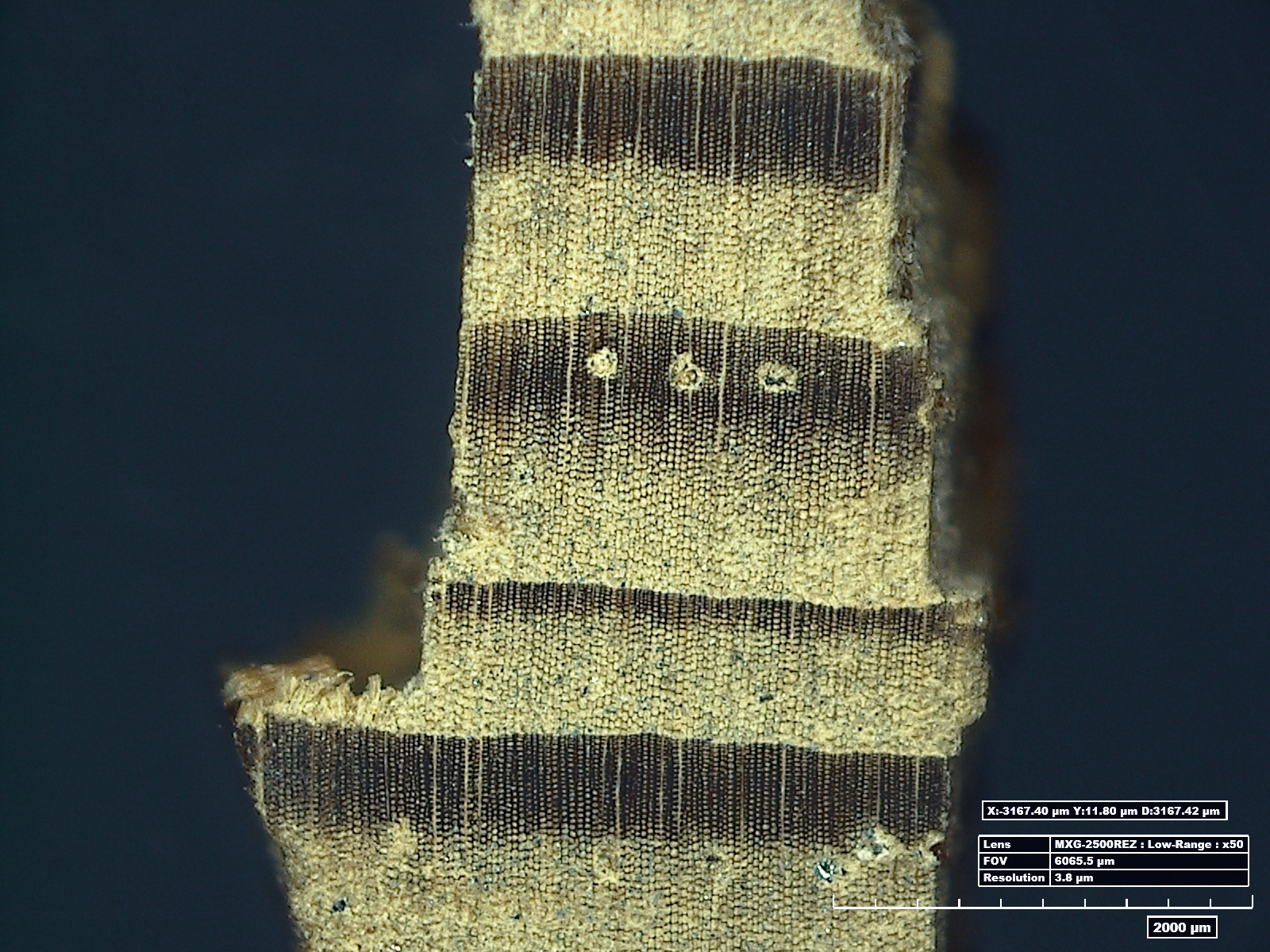 This microscopic image of the PL Belly panel of the Horten Ho 229 V3 aircraft shows an abrupt transition from early (light colored) to late (dark colored) wood. (Lumber Transverse View)