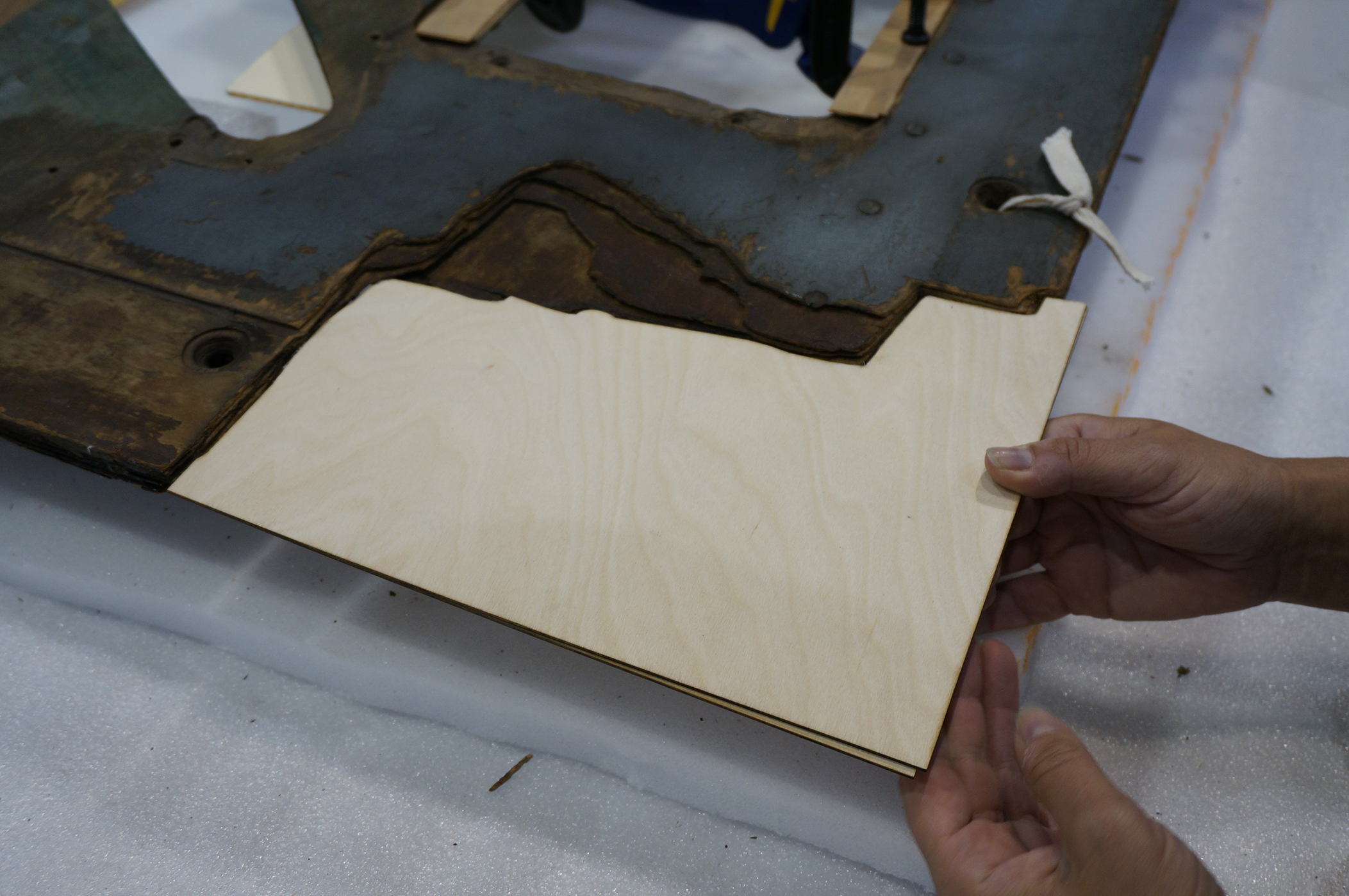 Staff work to fill areas of missing plywood on the Horten Ho 229 V3 by creating highly-detailed fills. Areas of loss on the aircraft are carefully traced on Mylar and then transferred to digital line drawings. A laser cutter uses the drawings to create precise cuts on each layer of the fill. Layers are finally adhered in place one layer at a time to create a complete plywood fill.