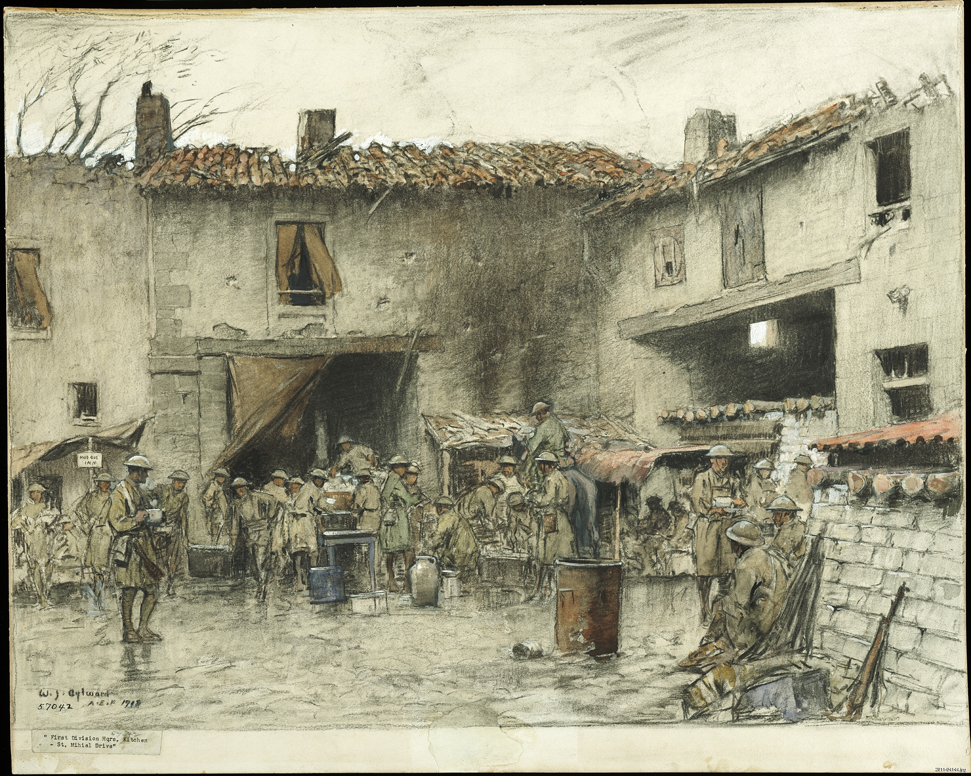 First Division Headquarters Kitchen, St. Mihiel Drive by William James Aylward, Charcoal and gouache on card, 1918