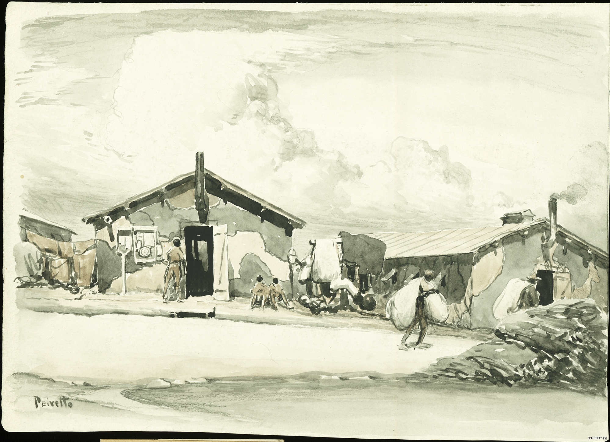 Camouflaged Barracks for Colored Troops, Airing the Bedding on Sunday by Ernest Clifford Peixotto, Pen and ink wash on paper, 1918