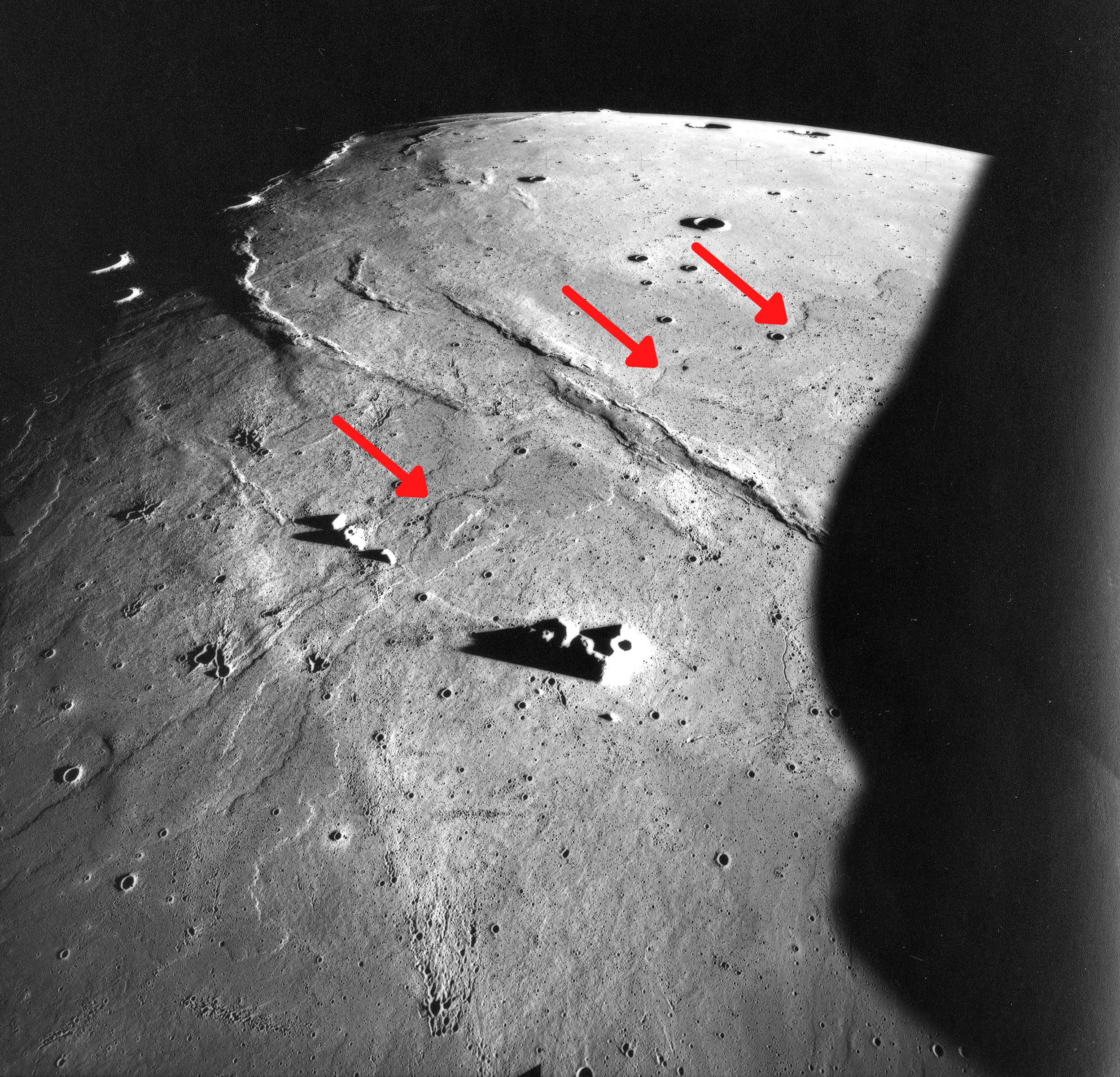 Lava flows that cooled billions of years ago extend across the Moon's surface. These are about 115 feet (35 meters) thick at their borders. The low Sun angle helps highlight these features which are outlined by crinkled edges. In this image, red arrows point to the basalt flows.