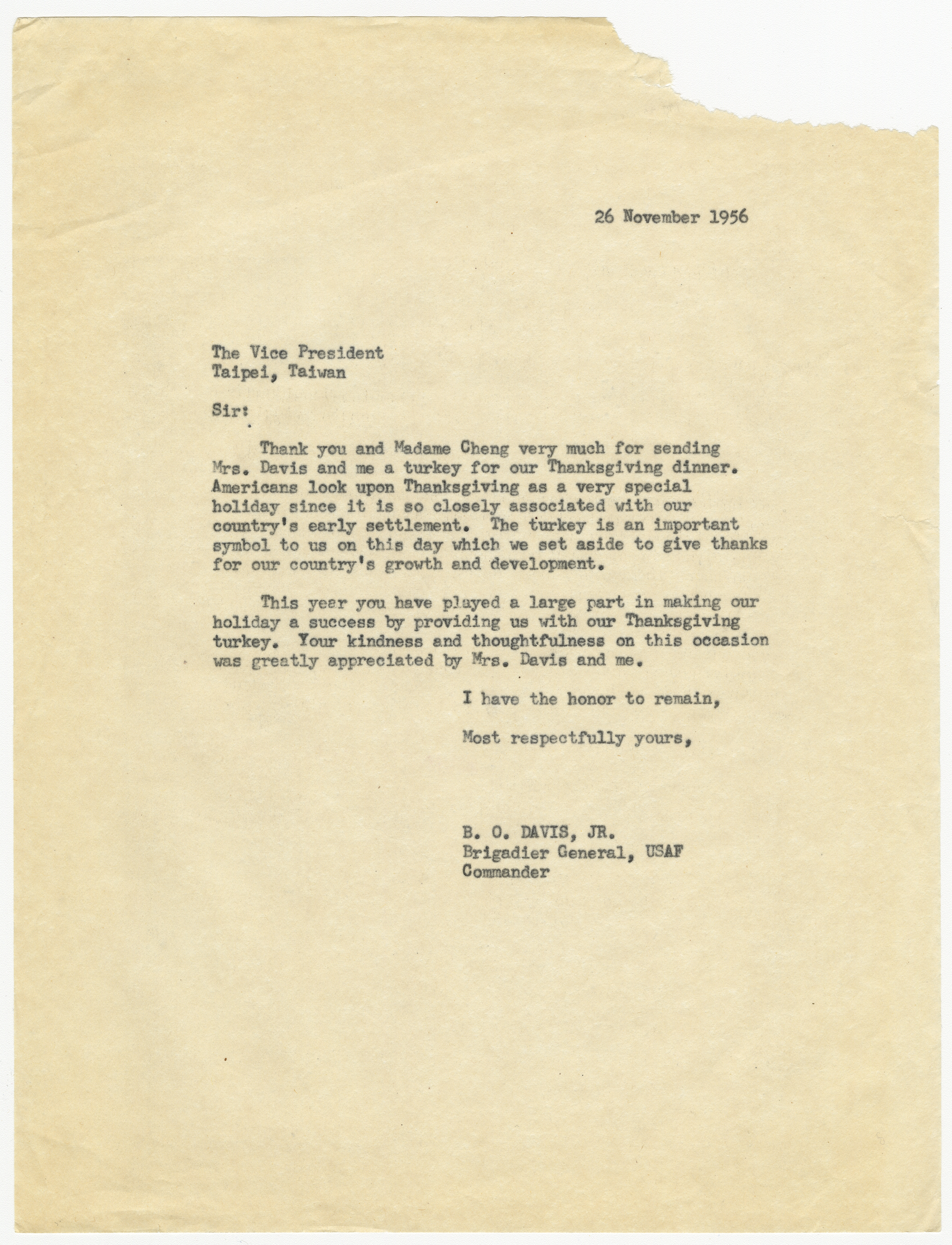 Carbon copy of a November 26, 1956, letter from Brigadier General Benjamin O. Davis, Jr., Commander, US Air Force Air Task Force 13 (Provisional), Taipei, Taiwan, to Chen Cheng, Vice President of the Republic of China (Taiwan), thanking him for the gift of a turkey for the Davis' Thanksgiving dinner.