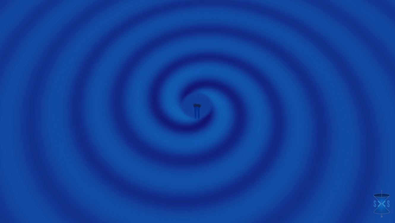 This mathematical animation shows the gravitational waves produced as two black holes spiral toward each other and then collide.