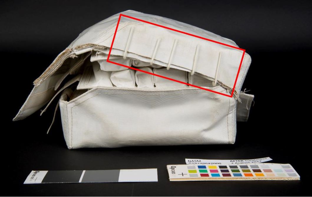 After treatment detail of clips used to stabilize the cut wall of the medical accessory kit lid. Credit: National Air and Space Museum