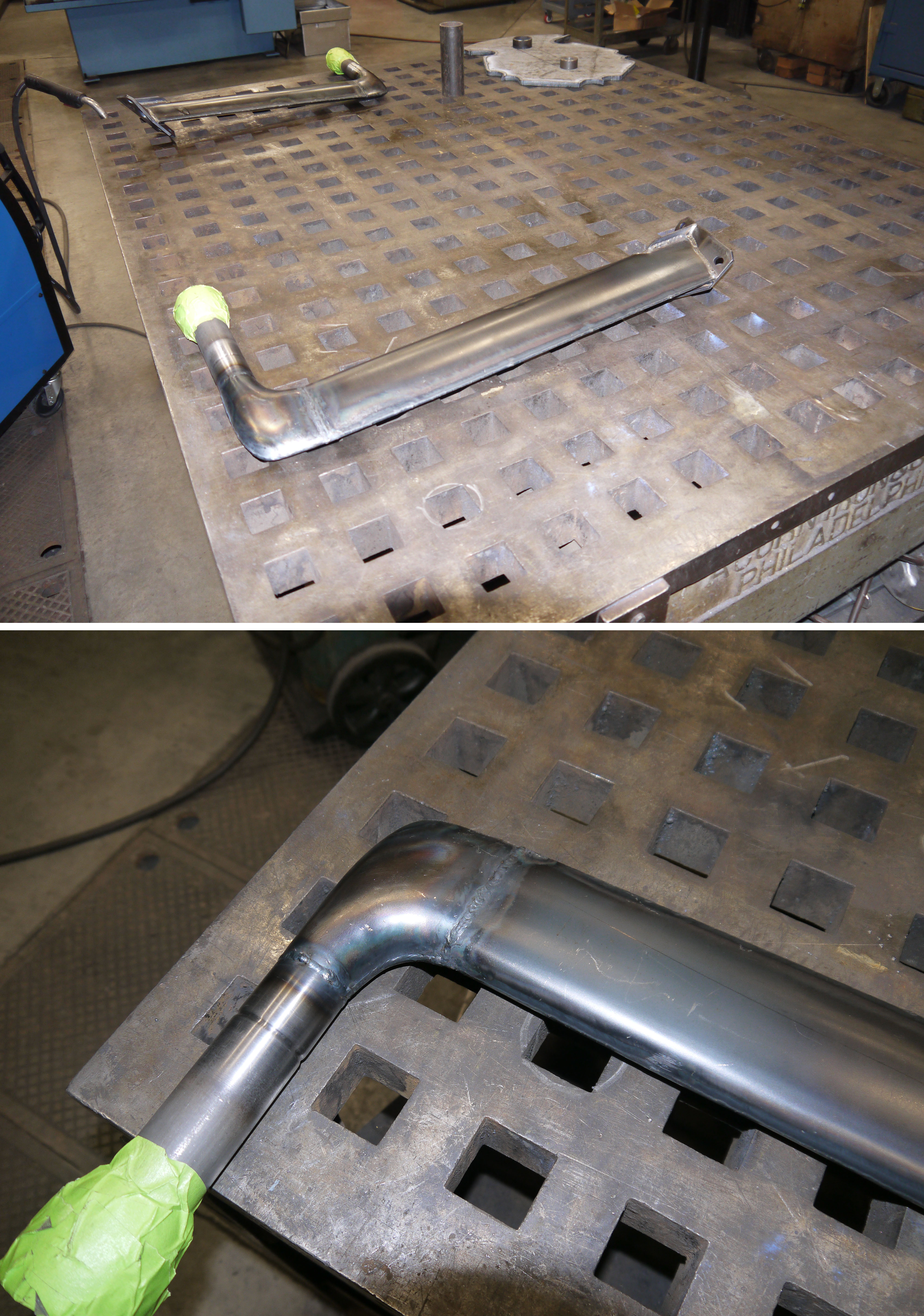 [Top] One radar mast fully welded. [Bottom] Detail view of the elbow welded in place along the newly fabricated mast—part of the process in fabricating the mast elbows from the radar array of the Heinkel He 219 A-2. (NASM)
