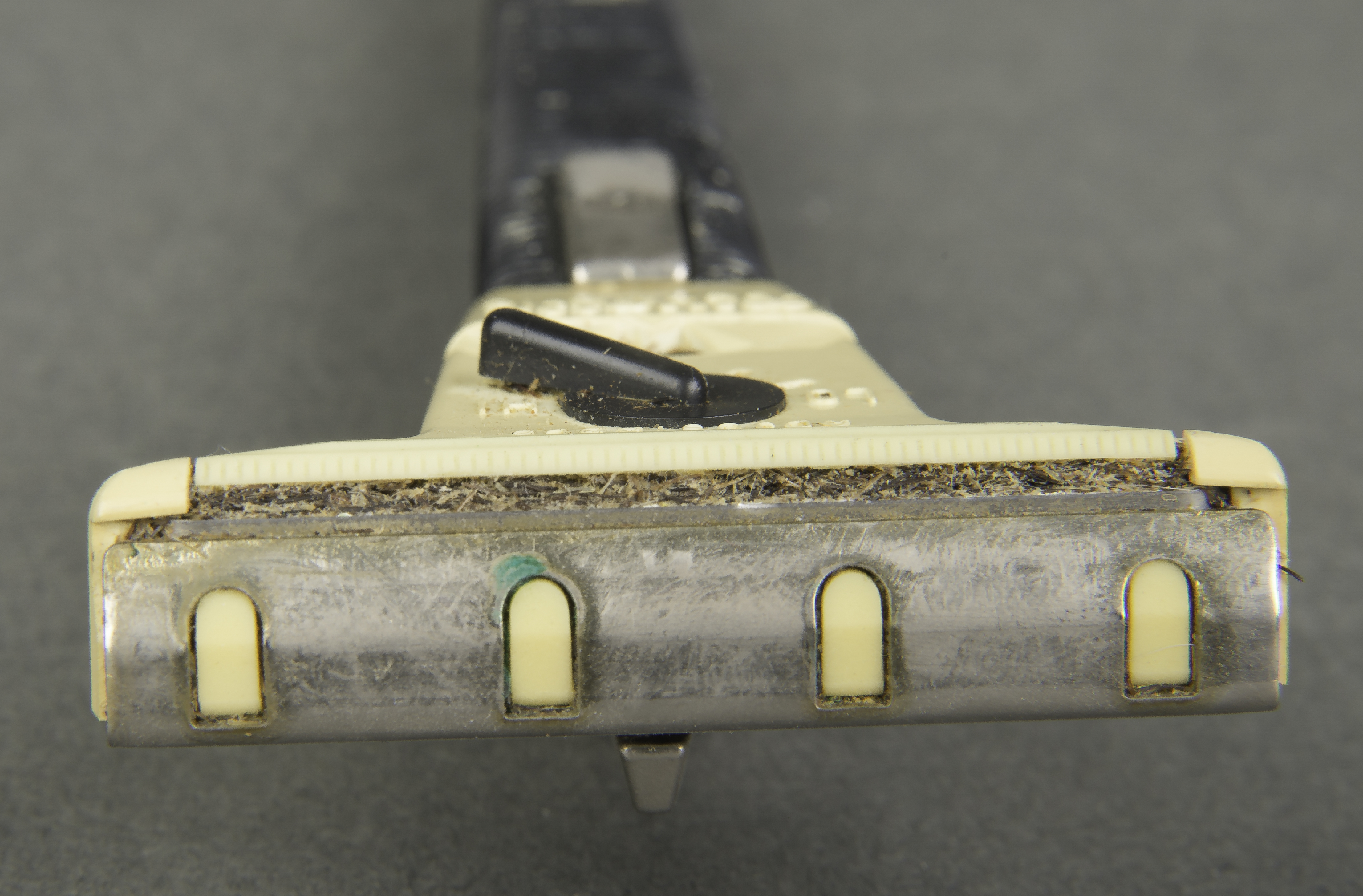 Hair and other material caught in Michael Collins' Apollo 11 razor blade from use along with the waxy, green-colored corrosion, which has formed on the surface.