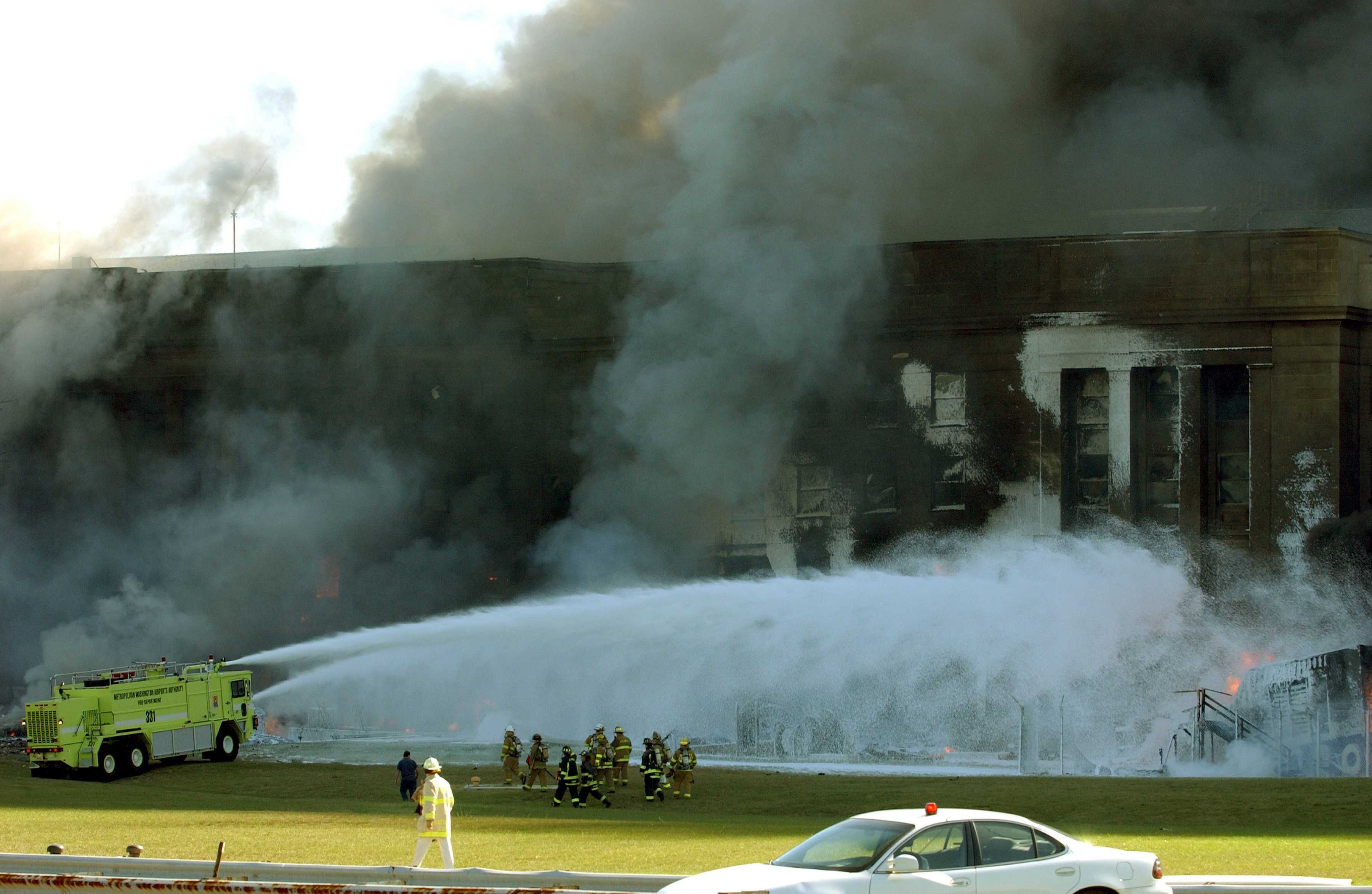 Foam 331 seen shortly after its arrival at the impact site, spraying foam from its bumper and roof turrets. (National Archives and Records Administration, RG 330, DM-SD-02-03883)