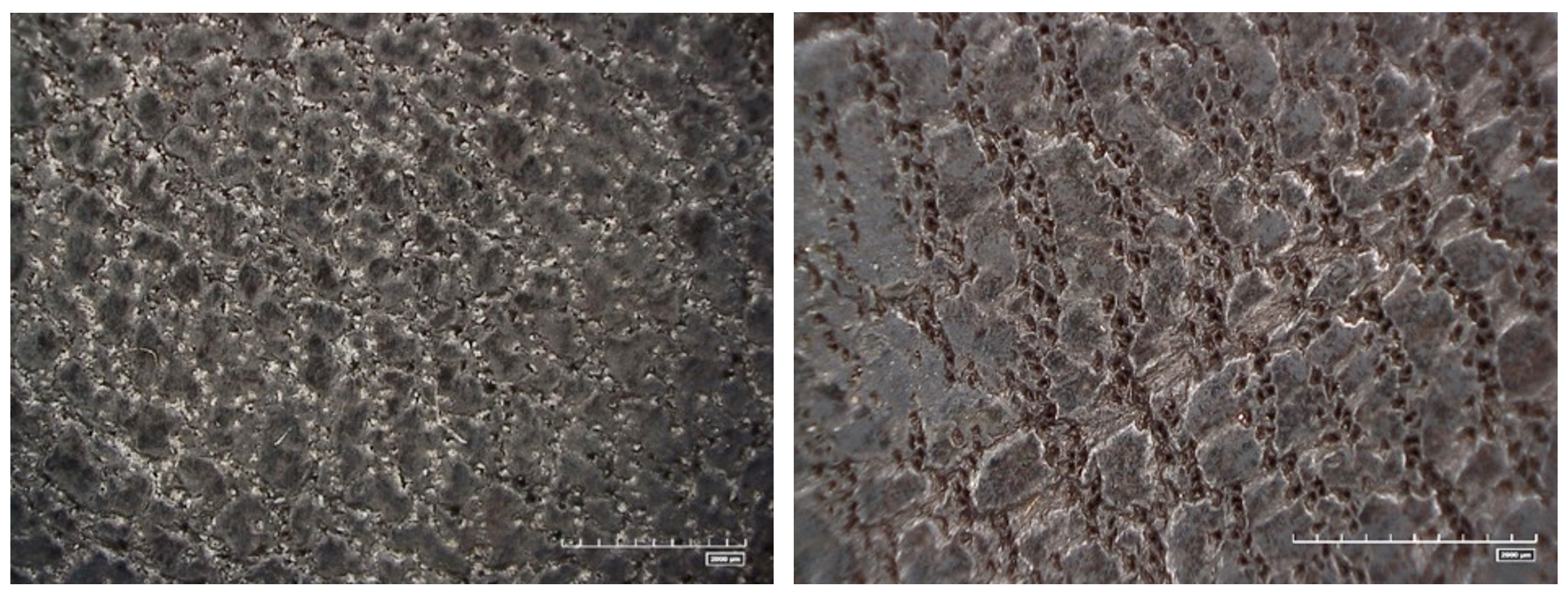 Figure 11: (Left): Before treatment, detail of white bloom exuding from the hair follicles of the leather grain. (Right): After treatment, detail of leather grain after solvent cleaning, showing removal of the white bloom from hair follicles. Photomicrographs collected from the PL side of the helmet with the HiROX digital microscope.