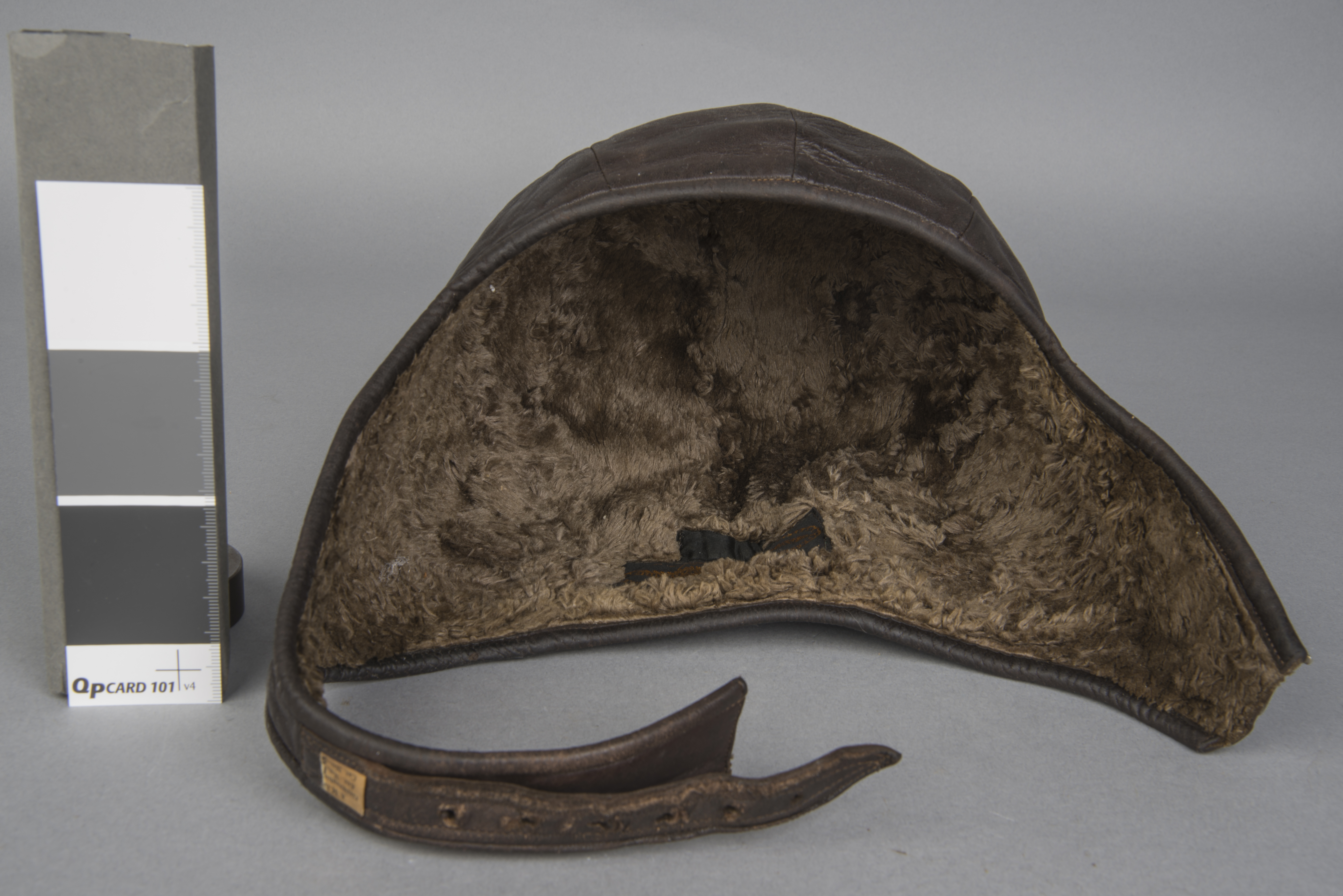 Figure 4: Interior of Anne Morrow Lindbergh’s leather flight helmet. The taupe faux fur completely lines the helmet interior to provide comfort and insulation.