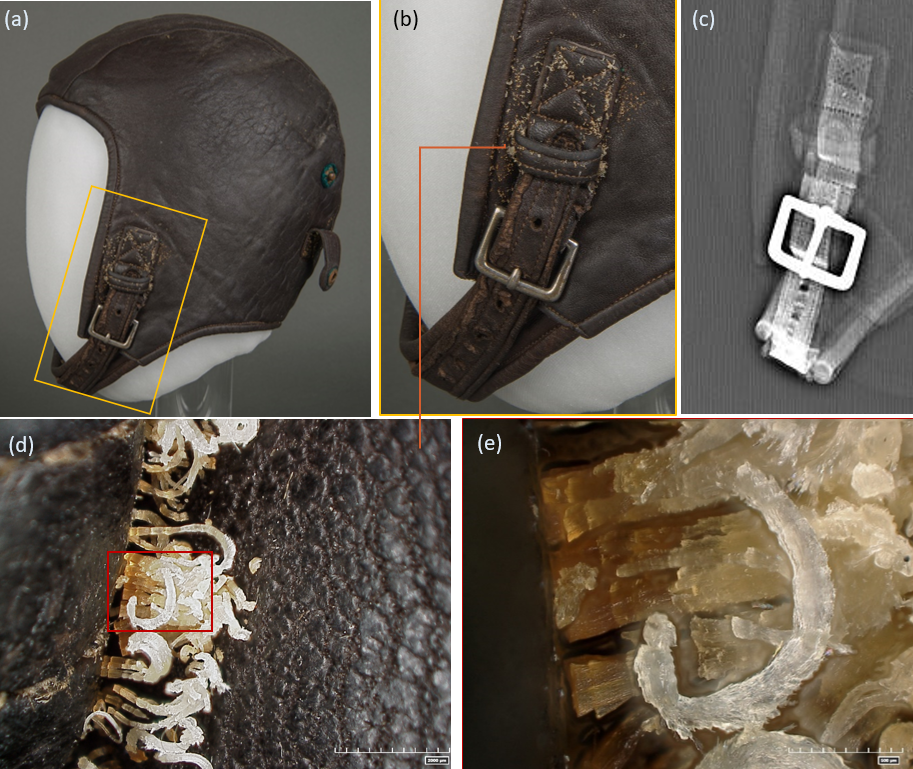 Figure 5: Waxy growth emerging from the grain of the leather. (a): Leather helmet, proper left side. (b): Detail of waxy segments in the chinstrap buckle region. (c): X-radiographic image of chinstrap buckle region. (d): Detail of waxy growth near the leather loop. (e): Photomicrograph details of waxy growth, showing a segmented structure.