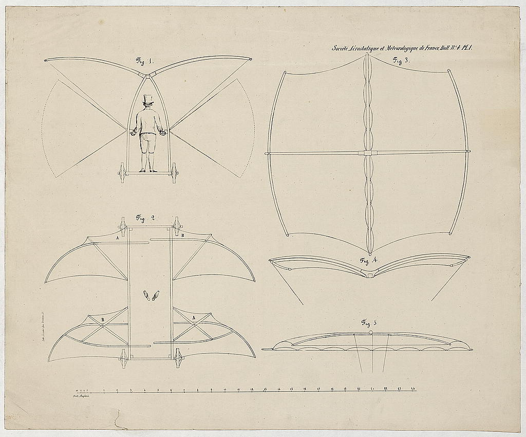 Cayley, George, Sir, Designer. Design drawing for a man-powered flying machine designed by Sir George Cayley / Lith. Jolicoeur, pass. Vendome, 25. , 1853. Photograph. https://www.loc.gov/item/2002736609/.