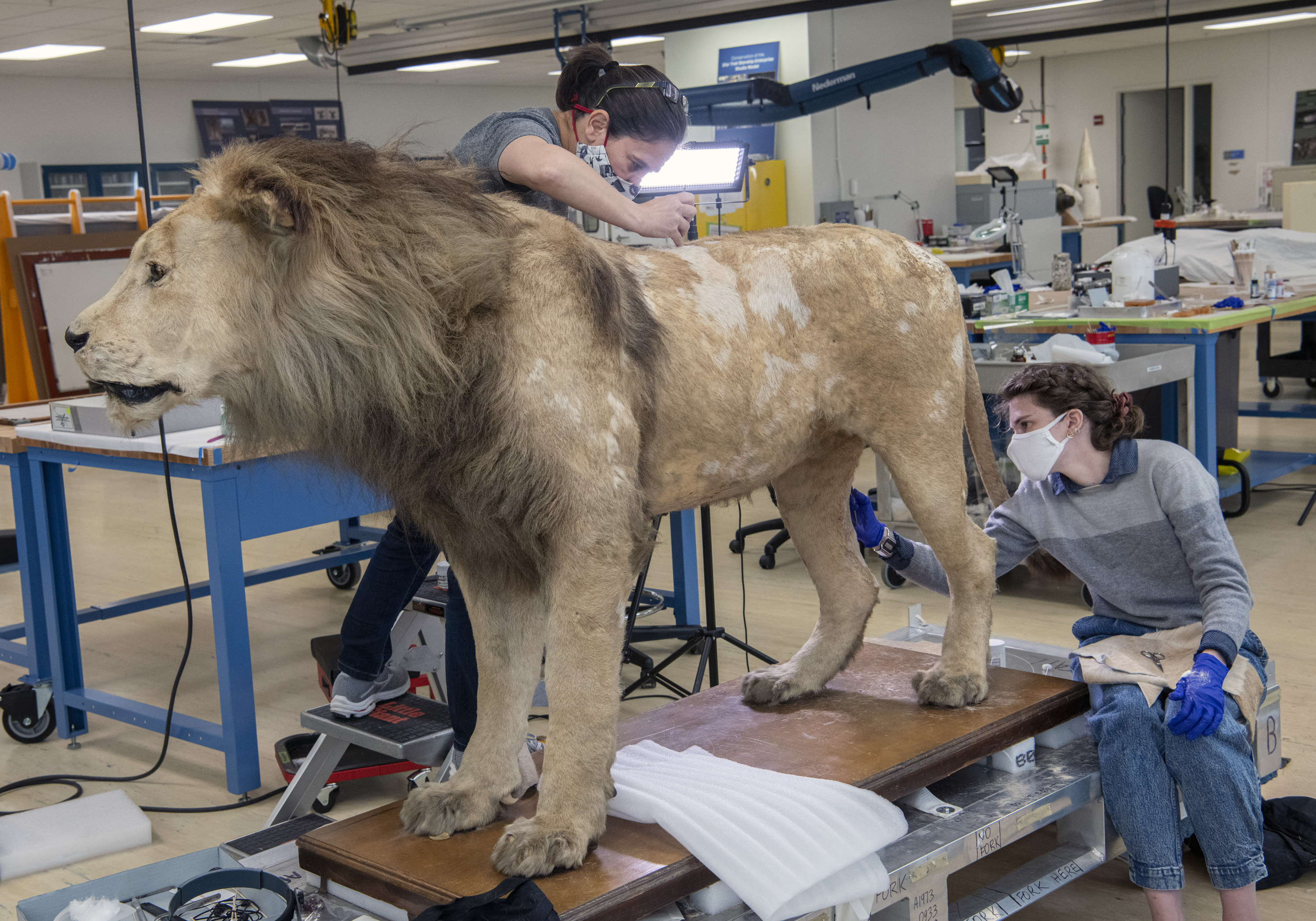 Museum conservators Lauren Horelick and Karen Wilcox applying hair to Gilmore’s areas of loss.